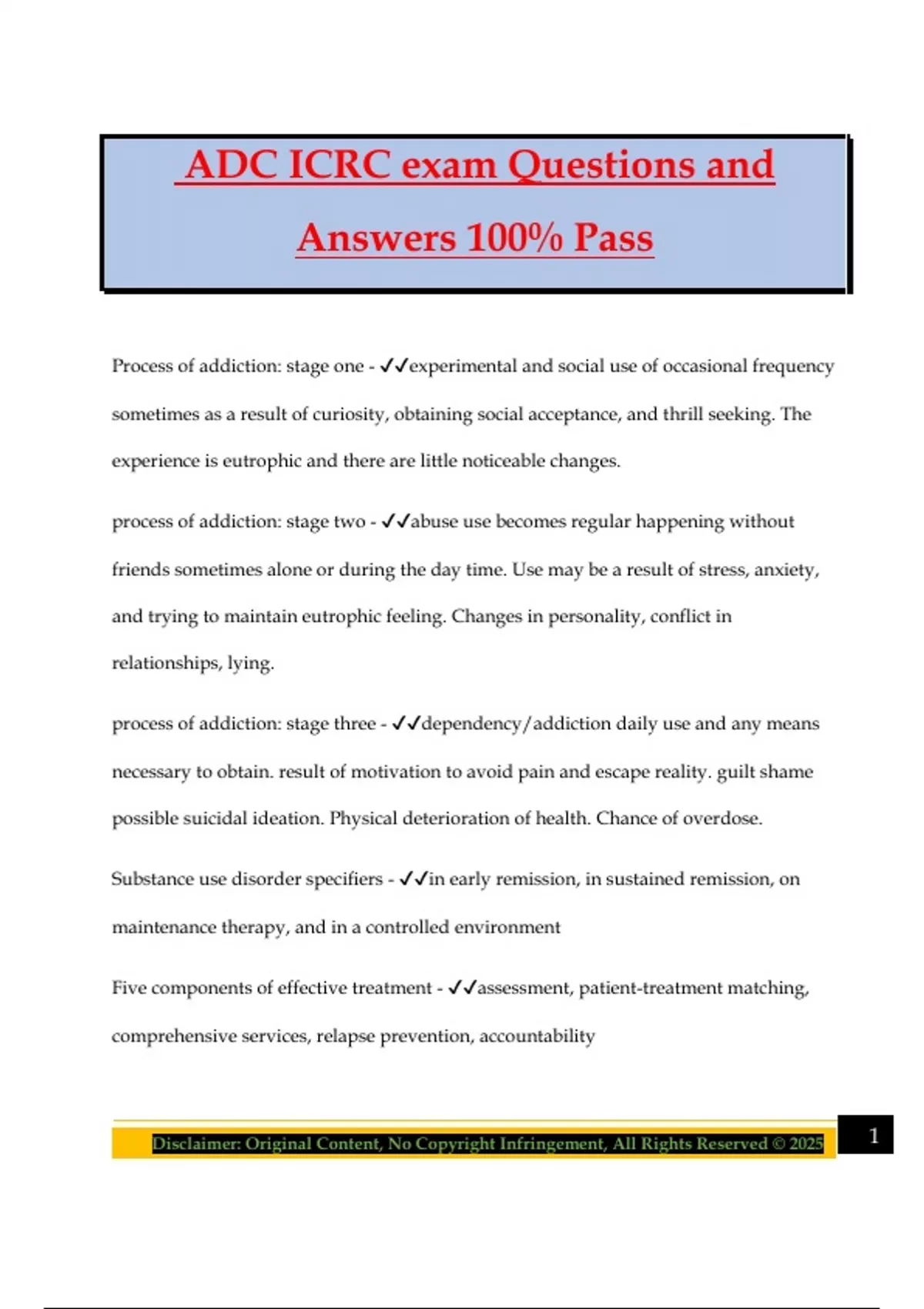 ADC ICRC exam Questions and Answers 100% Pass Process of addiction: stage one - experimental and social use of occasional frequency sometimes as a result of curiosity, obtaining social acceptance, and thrill seeking. The experience is eutrophic and there are little noticeable changes. process of addiction: stage two - abuse use becomes regular happening without friends sometimes alone or during the day time. Use may be a result of stress, anxiety, and trying to maintain eutrophic feeling. Changes in personality, conflict in relationships, lying. process of addiction: stage three - dependency/addiction daily use and any means necessary to obtain. result of motivation to avoid pain and escape reality. guilt shame possible suicidal ideation. Physical deterioration of health. Chance of overdose. Substance use disorder specifiers - in early remission, in sustained remission, on maintenance therapy, and in a controlled environment Five components of effective treatment - assessment, patient-treatment matching, comprehensive services, relapse prevention, accountability 2Disclaimer: Original Content, No Copyright Infringement, All Rights Reserved © 2025 central nervous system - consists of the brain and spinal cord peripheral nervous system - the sensory and motor neurons that connect the central nervous system to the rest of the body somatic nervous system - the division of the peripheral nervous system that controls the body's skeletal muscles autonomic nervous system - the part of the peripheral nervous system that controls the glands and the muscles of the internal organs (such as the heart). Its sympathetic division arouses; its parasympathetic division calms. sympathetic nervous system - part of the autonomic system that controls the "flight- or-fight" response in organisms. parasympathetic nervous system - the division of the autonomic nervous system that calms the body, conserving its energy Dopamine - A neurotransmitter associated with movement, attention and learning and the brain's pleasure and reward system. Acetylcholine - A neurotransmitter that enables learning and memory and also triggers muscle contraction Norepinephrine - A neurotransmitter involved in arousal, as well as in learning and mood regulation 3Disclaimer: Original Content, No Copyright Infringement, All Rights Reserved © 2025 Serotonin - A neurotransmitter that affects hunger,sleep, arousal, and mood. Gamma-aminobutyric acid (GABA) - Neurotransmitter that reduces activity across the synaptic cleft and thus inhibits a range of behaviors and emotions, especially generalized anxiety. Glycine - an inhibitory neurotransmitter found in the spine. enkephalins and endorphins - pain killing properties extracted from brain and pituitary gland. Reuptake - A process in which neurotransmitters are sponged up from the synaptic cleft by the presynaptic membrane. medulla oblongata - Part of the brainstem that controls vital life-sustaining functions such as heartbeat, breathing, blood pressure, and digestion.