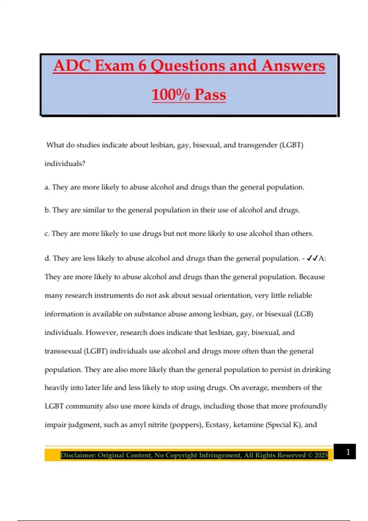 ADC Exam 6 Questions and Answers 100% Pass What do studies indicate about lesbian, gay, bisexual, and transgender (LGBT) individuals? a. They are more likely to abuse alcohol and drugs than the general population. b. They are similar to the general population in their use of alcohol and drugs. c. They are more likely to use drugs but not more likely to use alcohol than others. d. They are less likely to abuse alcohol and drugs than the general population. - A: They are more likely to abuse alcohol and drugs than the general population. Because many research instruments do not ask about sexual orientation, very little reliable information is available on substance abuse among lesbian, gay, or bisexual (LGB) individuals. However, research does indicate that lesbian, gay, bisexual, and transsexual (LGBT) individuals use alcohol and drugs more often than the general population. They are also more likely than the general population to persist in drinking heavily into later life and less likely to stop using drugs. On average, members of the LGBT community also use more kinds of drugs, including those that more profoundly impair judgment, such as amyl nitrite (poppers), Ecstasy, ketamine (Special K), and 2Disclaimer: Original Content, No Copyright Infringement, All Rights Reserved © 2025 gamma hydroxybutyrate. These drugs are frequently used at parties and raves, during and after which increased risky sexual behavior may lead to human immunodeficiency virus/acquired immunodeficiency syndrome (HIV/AIDS) or hepatitis infections. Cultural groups differ in how they view their LGBT members. In Hispanic culture, matters of sexual orientation tend not to be discussed openly. LGB members of minority groups often find themselves targets of discrimination within their minority culture and of racism in the general culture. What does the term cultural brokering refer to? a. Immigration and naturalization assistance b. Financial managers for ethnic and racial minorities c. Housing services for ethnic and racial minorities d. Liaison work between cultures to meet needs - D: Liaison work between cultures to meet needs. The culture brokering approach was conceived to mediate the difficult gap between the needs of foreign-born people and the U.S. health care system. This model can also help clients with disabilities and impairments. Almost one-sixth of all U.S. citizens have some functional disability. Of these, more than 30 percent live below the poverty line, and most expend considerable financial resources on their disability- related needs. The combination of depression, frequent pain, employment difficulties, and functional limitations leaves the cognitively and physically disabled vulnerable to substance abuse. Yet, research reveals, they are less likely to receive effective treatment 3Disclaimer: Original Content, No Copyright Infringement, All Rights Reserved © 2025 than those without any disability. Further, many disabled (and other) individuals struggling with addiction have unidentified learning disabilities that can impair successful treatment. Even individuals with the same disability may differ in their functional capabilities and limits. Consequently, treatment providers must carefully assess these clients and tailor treatments to meet their unique needs. How do the rates of heavy alcohol use among youth ages twelve to seventeen in rural areas compare? a. Double the rates in metropolitan areas b. Slightly higher than the rates in metropolitan areas c. About the same as the rates in metropolitan areas d. Half the rates found in metropolitan areas - A: Double the rates in metropolitan areas. The rate of alcohol use among adults over the age twenty-five is lower in rural areas than that found in metropolitan areas. However, youth between the ages of twelve and seventeen have rates of heavy alcohol use that are almost double those in metropolitan areas. Further, rates of alcohol use and alcoholism among women in rural areas are higher than rates among women in metropolitan areas. Even so, at least one study reveals that individuals living in urban settings were treated for substance abuse more than twice as often as those living in a rural setting. It was concluded that the stigma of substance abuse treatment and the availability of treatment combined to substantially limit the treatment rate. Given that 20 percent of the U.S. population lives 4Disclaimer: Original Content, No Copyright Infringement, All Rights Reserved © 2025 outside of metropolitan areas, understanding the unique needs of rural populations is important. Although homeless individuals are more likely to receive detoxification services than people not homeless, what percentage will receive full treatment for their alcohol or substance abuse problems? a. 15 percent b. 25 percent c. 35 percent d. 45 percent - B: 25 percent. In other words, 75 percent will not receive proper treatment. Although the homeless receive detox services more than three times as often as people who are not homeless (45 percent vs. 14 percent), this is likely due to unexpected hospitalizations, psychiatric facility transitioning, and vagrancy and drug possession arrests that result in an involuntary detox and loose medical supervision. Of the approximately six hundred thousand homeless at any given time, about 41 percent are white, 40 percent are African-American, 11 percent are Hispanic, and 8 percent are Native American—disproportionate minority representation. The homeless may be: (1) transient—temporarily with others and at high risk of suddenly being on the street; (2) recently displaced—due to eviction or other financial problems (potentially due to substance abuse; or (3) chronically homeless—often with severe substance use and 5Disclaimer: Original Content, No Copyright Infringement, All Rights Reserved © 2025 mental disorders, they are difficult to draw into treatment and are in need of creative outreach and programming initiatives. Homeless