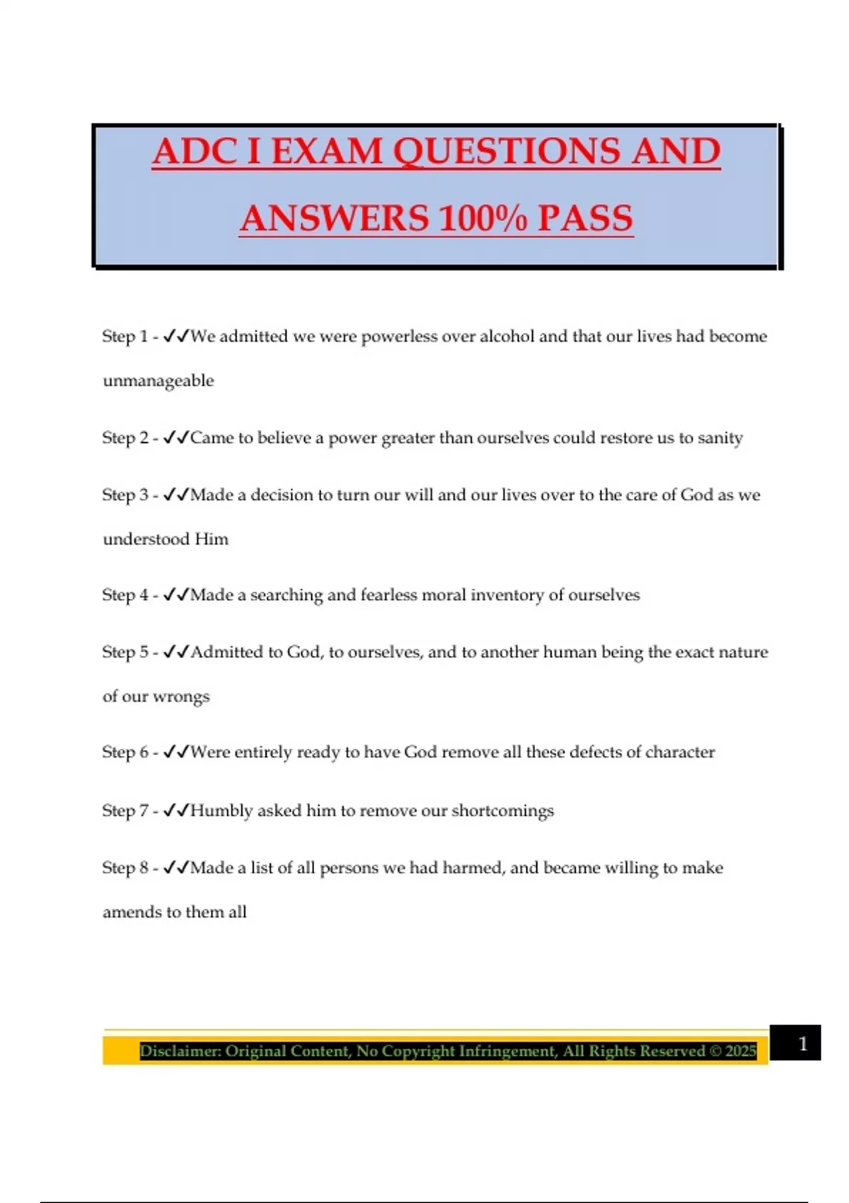 ADC I EXAM QUESTIONS AND ANSWERS 100% PASS Step 1 - We admitted we were powerless over alcohol and that our lives had become unmanageable Step 2 - Came to believe a power greater than ourselves could restore us to sanity Step 3 - Made a decision to turn our will and our lives over to the care of God as we understood Him Step 4 - Made a searching and fearless moral inventory of ourselves Step 5 - Admitted to God, to ourselves, and to another human being the exact nature of our wrongs Step 6 - Were entirely ready to have God remove all these defects of character Step 7 - Humbly asked him to remove our shortcomings Step 8 - Made a list of all persons we had harmed, and became willing to make amends to them all 2Disclaimer: Original Content, No Copyright Infringement, All Rights Reserved © 2025 Step 9 - Made direct amends to such people wherever possible, except when to do so would injure them or others Step 10 - Continued to take personal inventory and when we were wrong promptly admitted it Step 11 - Sought through prayer and meditation to improve our conscious contact with God as we understood Him, praying only for knowledge of His will for us and the power to carry that out Step 12 - Having had a spiritual awakening as the result of these steps, we tried to carry this message to alcoholics, and to practice these principles in all our affairs Surrender Steps - steps 1, 2, 3 •We admitted we were powerless over alcohol & that our lives had become unmanageable •Came to believe that a power greater than ourselves could restore us to sanity •Made a decision to turn our will and our lives over to the care of God as we understood Him Self-examination - steps 4, 5 •Made a searching and fearless moral inventory of ourselves 3Disclaimer: Original Content, No Copyright Infringement, All Rights Reserved © 2025 •Admitted to God, to ourselves and to another human being the exact nature of our wrongs Working Steps - Steps 6, 7, 8, 9 •We entirely ready to have God remove all these defects of character •Humbly asked Him to remove our shortcomings •Made a list of all persons we had harmed and became willing to make amends to them all •Made direct amends to such people wherever pos