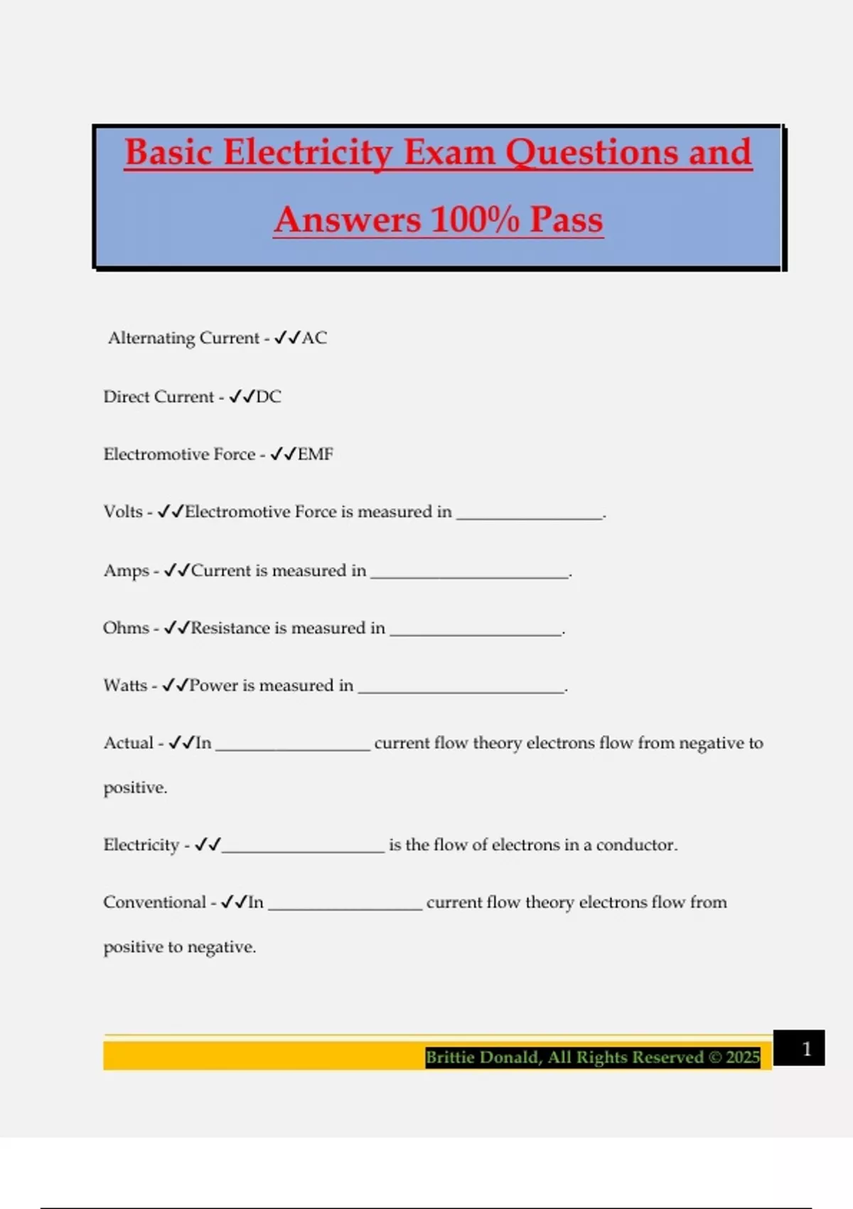 Basic Electricity Exam Questions and Answers 100% Pass Alternating Current - AC Direct Current - DC Electromotive Force - EMF Volts - Electromotive Force is measured in _________________. Amps - Current is measured in _______________________. Ohms - Resistance is measured in ____________________. Watts - Power is measured in ________________________. Actual - In __________________ current flow theory electrons flow from negative to positive. Electricity - ___________________ is the flow of electrons in a conductor. Conventional - In __________________ current flow theory electrons flow from positive to negative. 2Brittie Donald, All Rights Reserved © 2025 Current - ______________ delivers electrical power to its point of use. Direct Current - ______________________ electricity flows in only one direction. Positive - The highest potential of current flow in conventional current theory is the ___________ terminal. Negative - The lowest potential of current flow in conventional current theory is the ___________ terminal. Circuit - Any path that allows the electrons to leave the power supply an return to the power supply is called a Battery - A _____________ is a common source of DC current. AC or Alternating - _____________ current flows alternately in one direction and then the other. 60 - The AC electricity produced in the U.S cycles ___________ times per second. Hertz or Hz - Frequency is measured in ______