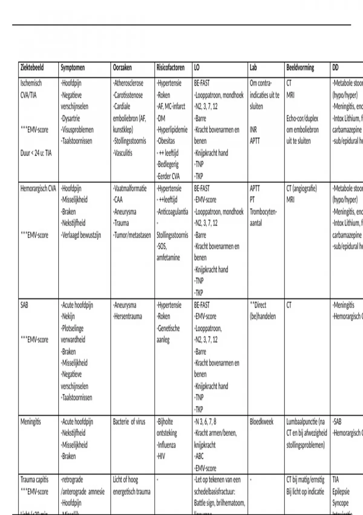 Hemorargisch CVA -Hoofdpijn -Vaatmalformatie -Hypertensie BE-FAST APTT CT (angiografie) -Metabole stoor