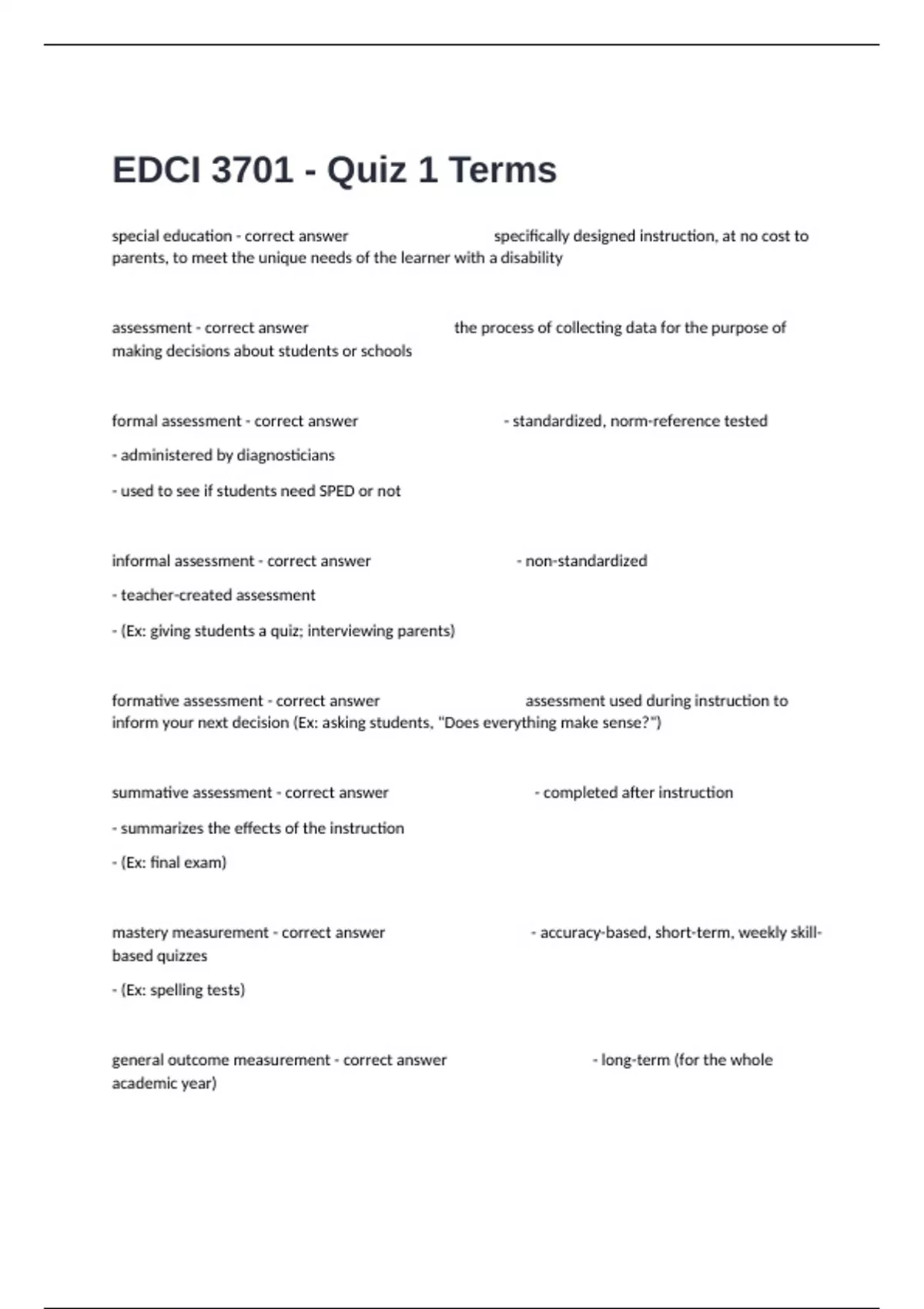 special education - correct answer specifically designed instruction, at no cost to parents, to meet the unique needs of the learner with a disability assessment - correct answer the process of collecting data for the purpose of making decisions about students or schools formal assessment - correct answer - standardized, norm-reference tested - administered by diagnosticians - used to see if students need SPED or not informal assessment - correct answer - non-standardized - teacher-created assessment - (Ex: giving students a quiz; interviewing parents) formative assessment - correct answer assessment used during instruction to inform your next decision (Ex: asking students, "Does everything make sense?") summative assessment - correct answer - completed after instruction - summarizes the effects of the instruction - (Ex: final exam) mastery measurement - correct answer - accuracy-based, short-term, weekly skill-based quizzes - (Ex: spelling tests) general outcome measurement - correct answer - long-term (for the whole academic year) - rate-based - curriculum focused - occurs weekly - (Ex: naming 20 letters in 1 minute) curriculum-based measurement (CBM) - correct answer - standardized rate-based assessment for progress monitoring (ex: general outcome measurement) - tests certain skills of the students and their academic progress - repeated testing using specific administration & scoring guidelines - time + accuracy based (means rate-based) - specific example of CBA - targets reading, math, language, writing, social studies, & science benchmarks - correct answer a score that tells you where a student is at (assessment for "at-risk" for SPED or not) screening - correct answer - early on - determines which students need help - (ex: DIBELS benchmark) entitlement - correct answer the formal eligibility determination process for SPED or gifted progress monitoring - correct answer determining if the new SPED program implemented is working (assessed weekly to measure success) accountability - correct answer determining if programs (like LEAP) are working