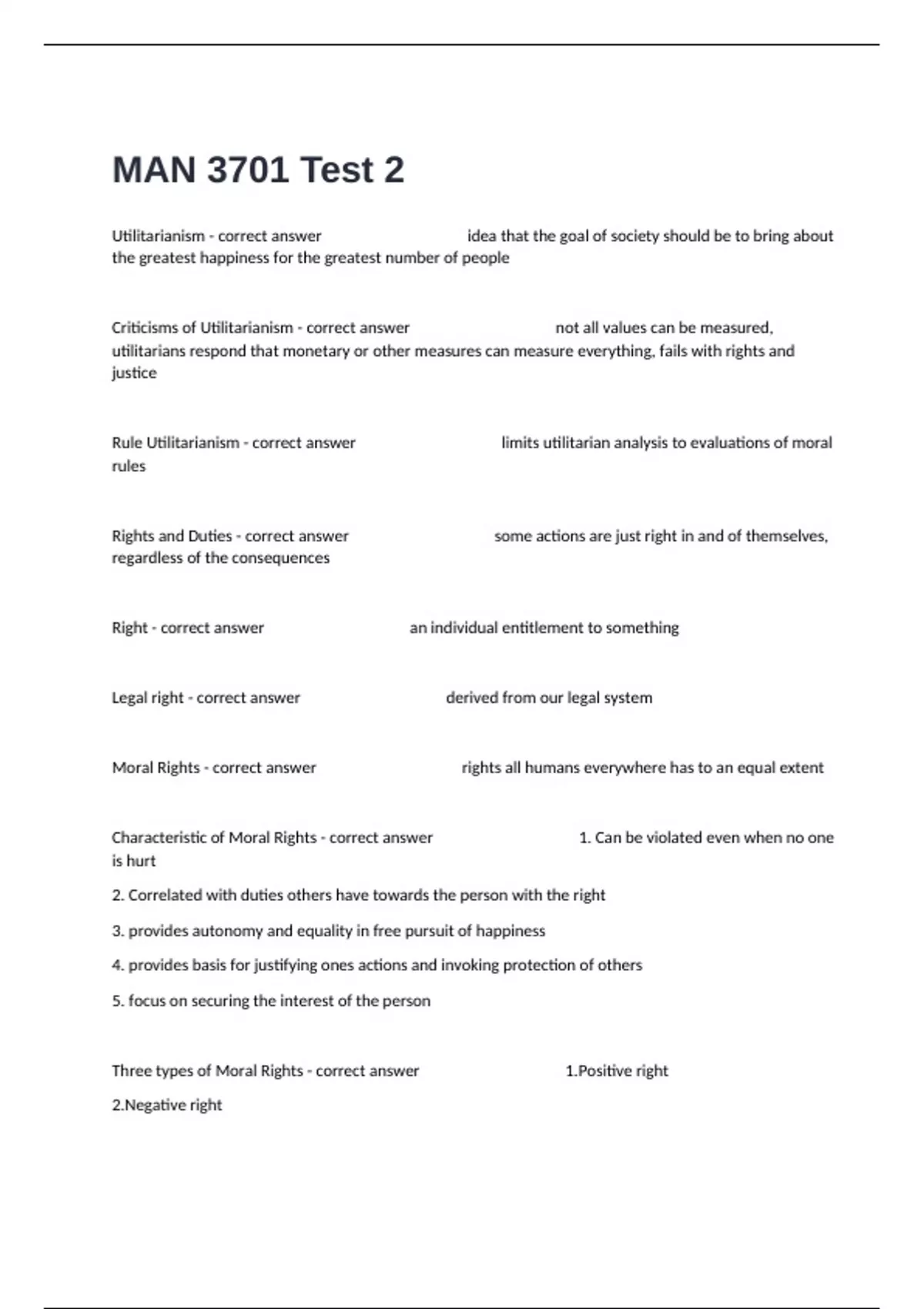 Utilitarianism - correct answer idea that the goal of society should be to bring about the greatest happiness for the greatest number of people Criticisms of Utilitarianism - correct answer not all values can be measured, utilitarians respond that monetary or other measures can measure everything, fails with rights and justice Rule Utilitarianism - correct answer limits utilitarian analysis to evaluations of moral rules Rights and Duties - correct answer some actions are just right in and of themselves, regardless of the consequences Right - correct answer an individual entitlement to something Legal right - correct answer derived from our legal system Moral Rights - correct answer rights all humans everywhere has to an equal extent Characteristic of Moral Rights - correct answer 1. Can be violated even when no one is hurt 2. Correlated with duties others have towards the person with the right 3. provides autonomy and equality in free pursuit of happiness 4. provides basis for justifying ones actions and invoking protection of others 5. focus on securing the interest of the person Three types of Moral Rights - correct answer 1.Positive right 2.Negative right 3.Contractual right Positive Rights - correct answer rights require others help us Negative rights - correct answer rights require others leave us alone Contractual rights - correct answer require people keep their agreement Four conditions of a contract - correct answer 1. are created by specific agreements and conferred only on the parties involved 2. require publicly accepted rules on what constitutes agreements 3. underline the special rights and duties imposed by accepting a position in a organization 4. one of the parties to know whats agreed, no misrepresentation, no coercion, no agreement to an immoral act Kant's Categorical Imperative #1 - correct answer must act only on reasons we would be willing to have anyone in a similar situation act on; universalizability and reversibility Kant's Categorical Imperative #2 - correct answer never use people only as a means to your ends, treat them freely and rationally consent; human have dignity Criticisms of Kant - correct answer versions are unclear s can conflict and Kant can't solve conflicts 3. implies moral judgement that are mistaken Distributive Justice - correct answer requires just distribution of benefits and burdens Retributive Justice - correct answer requires just imposition of punishments and penalties