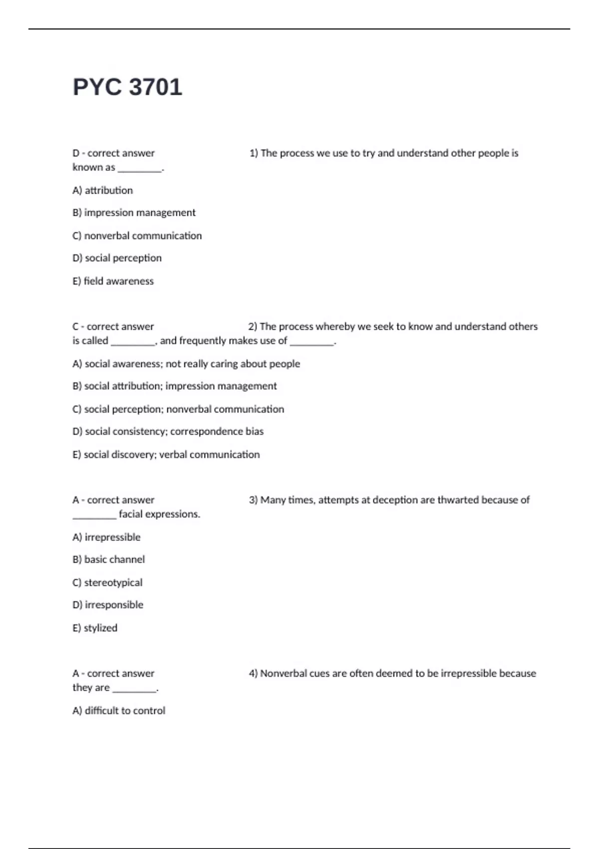 A - correct answer 4) Nonverbal cues are often deemed to be irrepressible because