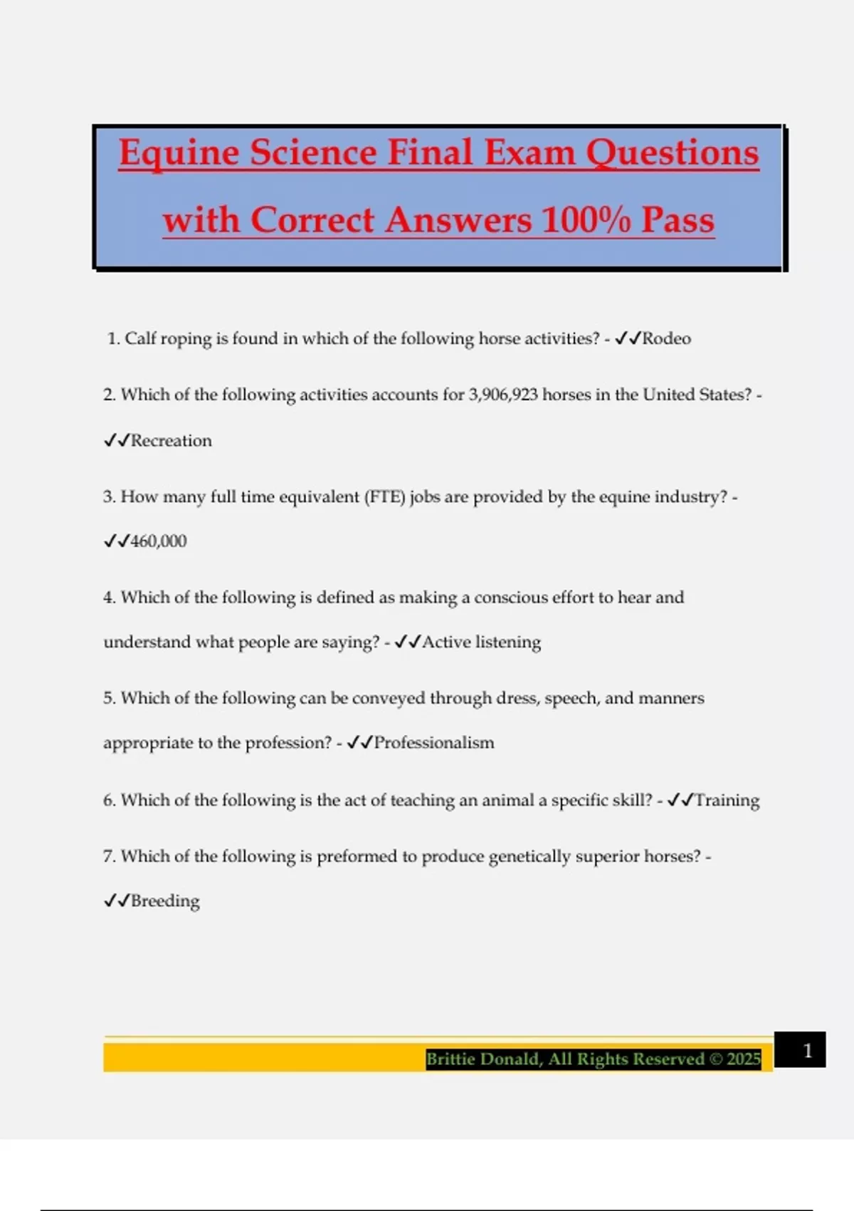 Equine Science Final Exam Questions with Correct Answers 100% Pass 1. Calf roping is found in which of the following horse activities? - Rodeo 2. Which of the following activities accounts for 3,906,923 horses in the United States? - Recreation 3. How many full time equivalent (FTE) jobs are provided by the equine industry? - 460,000 4. Which of the following is defined as making a conscious effort to hear and understand what people are saying? - Active listening 5. Which of the following can be conveyed through dress, speech, and manners appropriate to the profession? - Professionalism 6. Which of the following is the act of teaching an animal a specific skill? - Training 7. Which of the following is preformed to produce genetically superior horses? - Breeding
