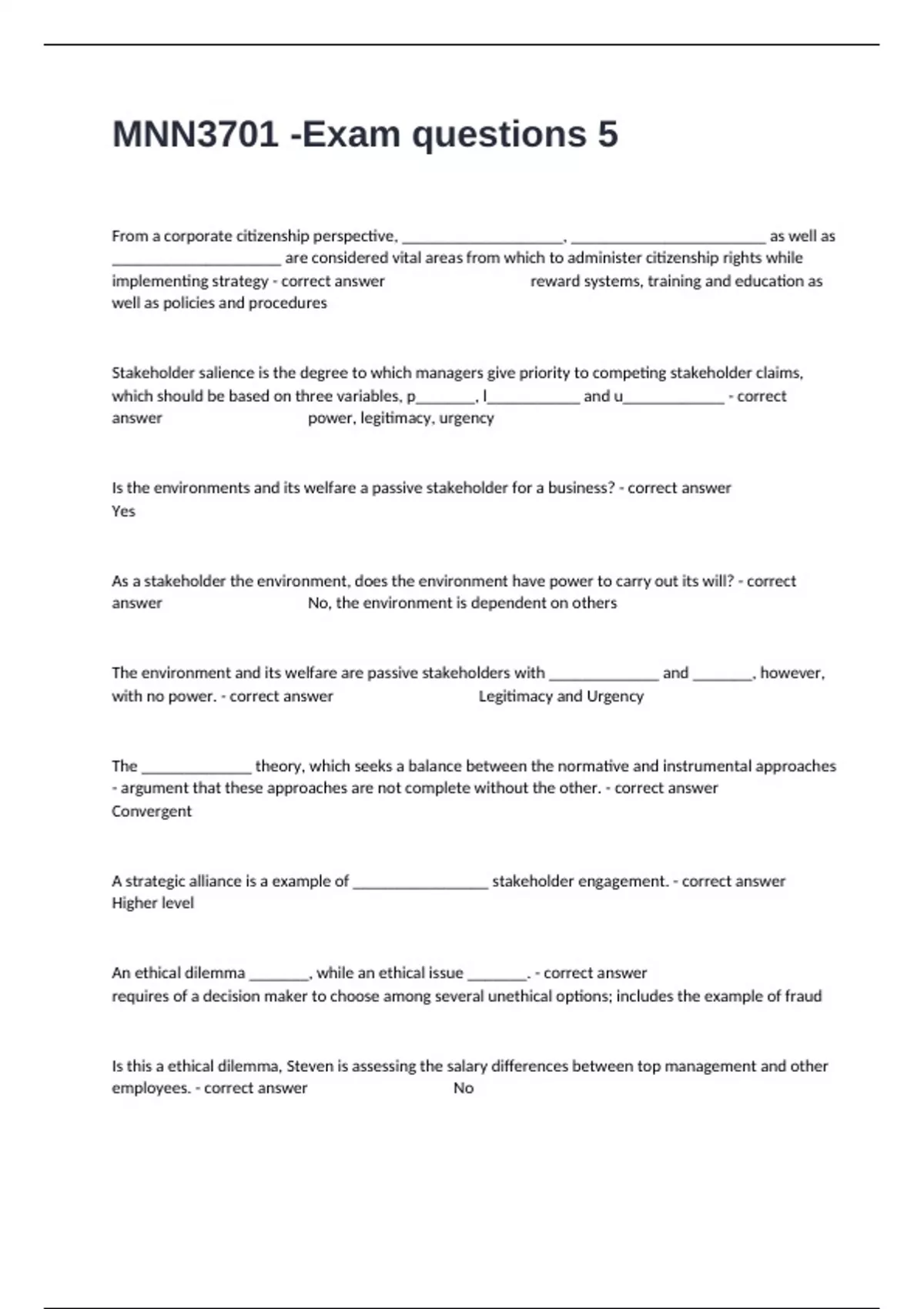 From a corporate citizenship perspective, ___________________, _______________________ as well as ____________________ are considered vital areas from which to administer citizenship rights while implementing strategy - correct answer reward systems, training and education as well as policies and procedures Stakeholder salience is the degree to which managers give priority to competing stakeholder claims, which should be based on three variables, p_______, l___________ and u____________ - correct answer power, legitimacy, urgency Is the environments and its welfare a passive stakeholder for a business? - correct answer Yes As a stakeholder the environment, does the environment have power to carry out its will? - correct answer No, the environment is dependent on others The environment and its welfare are passive stakeholders with _____________ and _______, however, with no power. - correct answer Legitimacy and Urgency The _____________ theory, which seeks a balance between the normative and instrumental approaches - argument that these approaches are not complete without the other. - correct answer Convergent A strategic alliance is a example of ________________ stakeholder engagement. - correct answer Higher level An ethical dilemma _______, while an ethical issue _______. - correct answer requires of a decision maker to choose among several unethical options; includes the example of fraud Is this a ethical dilemma, Steven is assessing the salary differences between top management and other employees. - correct answer No Is this a ethical dilemma, Harold is using company time and resources to get updates about his child who is in hospital. - correct answer Yes Is this a driver of business ethics or a benefit of business ethics, protection of the GoldMart Holdings reputation - correct answer Driver Is this a driver of business ethics or a benefit of business ethics, attracting prospective investors to GoldMart Holdings - correct answer Benefit Is this a driver of business ethics or a benefit of business ethics, maintaining investor confidence in GoldMart Holdings - correct answer Driver Is this a driver of business ethics or a benefit of business ethics, attracting high-quality employees to GoldMart Holdings - correct answer Benefit Is this a driver of business ethics or a benefit of business ethics, a number of competitive advantages at GoldMart Holdings - correct answer Benefit Is this a driver of business ethics or a benefit of business ethics, ensuring minimal lawsuits and related costs at GoldMart Holdings - correct answer Driver SDG 1: End __________ in all its forms everywhere. - correct answer Poverty SDG 2: End ________________, achieve food security and improved nutrition and promote sustainable agriculture. - correct answer Hunger SDG 3: Ensure ________ lives and promote wellbeing for all at all ages. - correct answer Healthy