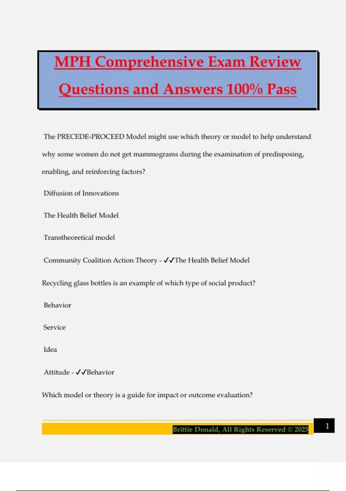 MPH Comprehensive Exam Review Questions and Answers 100% Pass The PRECEDE-PROCEED Model might use which theory or model to help understand why some women do not get mammograms during the examination of predisposing, enabling, and reinforcing factors? Diffusion of Innovations The Health Belief Model Transtheoretical model Community Coalition Action Theory - The Health Belief Model Recycling glass bottles is an example of which type of social product? Behavior Service Idea Attitude - Behavior Which model or theory is a guide for impact or outcome evaluation? 2Brittie Donald, All Rights Reserved © 2025 RE-AIM Model Ecological Models PRECEDE-PROCEED Model Social Marketing - RE-AIM Model Intervention at individual and group levels have been conducted to reduce HIV risk behaviors among the most vulnerable populations at highest risk in the United States. In spite of these interventions, African-American women remain the fastest growing segment of incident AIDS cases. Obviously, new research studies are needed to provide intervention at individual, family, community, and society levels. As an HIV/AIDS interventionist, which of the following factors will you consider as HIV/AIDS-related behavior to incorporate into your model in reducing HIV risky behaviors? Subjective norms Self-efficacy Knowledge Perceived risk All of the above - All of the above Obesity intervention often utilized community trials to increase physical activity. These trials are usually part of a "healthy heart" program and incorporate social and 3Brittie Donald, All Rights Reserved © 2025 environmental measures, including public service announcements about physical activity and total well-being. This approach in terms of health behavior model is best described as the: Social support model Ecologic model Health belief model Transtheoretical model Information, motivation and skill building model - Ecologic mode