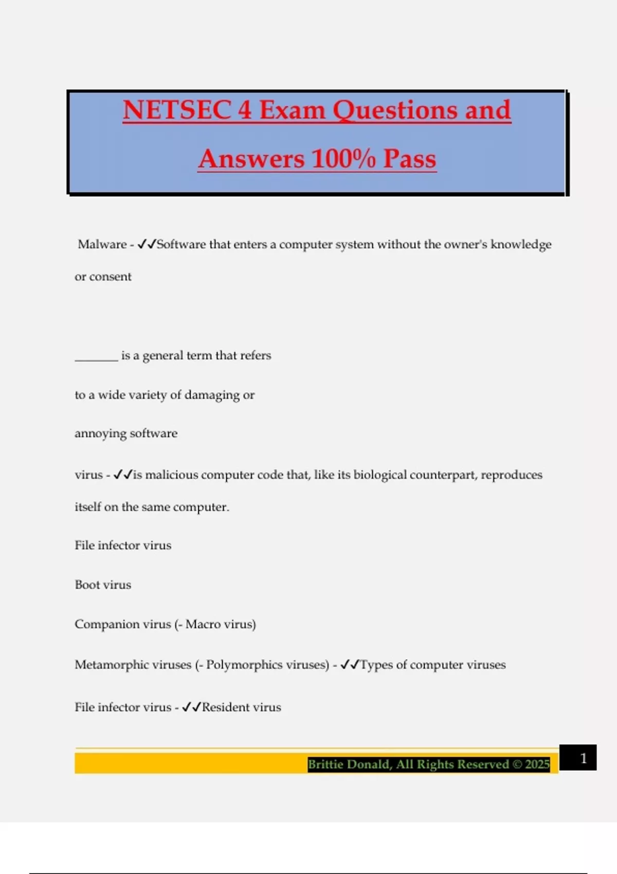 NETSEC 4 Exam Questions and Answers 100% Pass Malware - Software that enters a computer system without the owner's knowledge or consent _______ is a general term that refers to a wide variety of damaging or annoying software virus - is malicious computer code that, like its biological counterpart, reproduces itself on the same computer. File infector virus Boot virus Companion virus (- Macro virus) Metamorphic viruses (- Polymorphics viruses) - Types of computer viruses File infector virus - Resident virus 2Brittie Donald, All Rights Reserved © 2025 Companion virus - Macro virus Metamorphic viruses - Polymorphics viruses Worm - Program designed to take advantage of a vulnerability in an application or an operating system in order to enter a system can travel by itself does not require any user action to begin its execution - Worms are different from viruses in two regards: delete files remote control - Actions that worms have performe