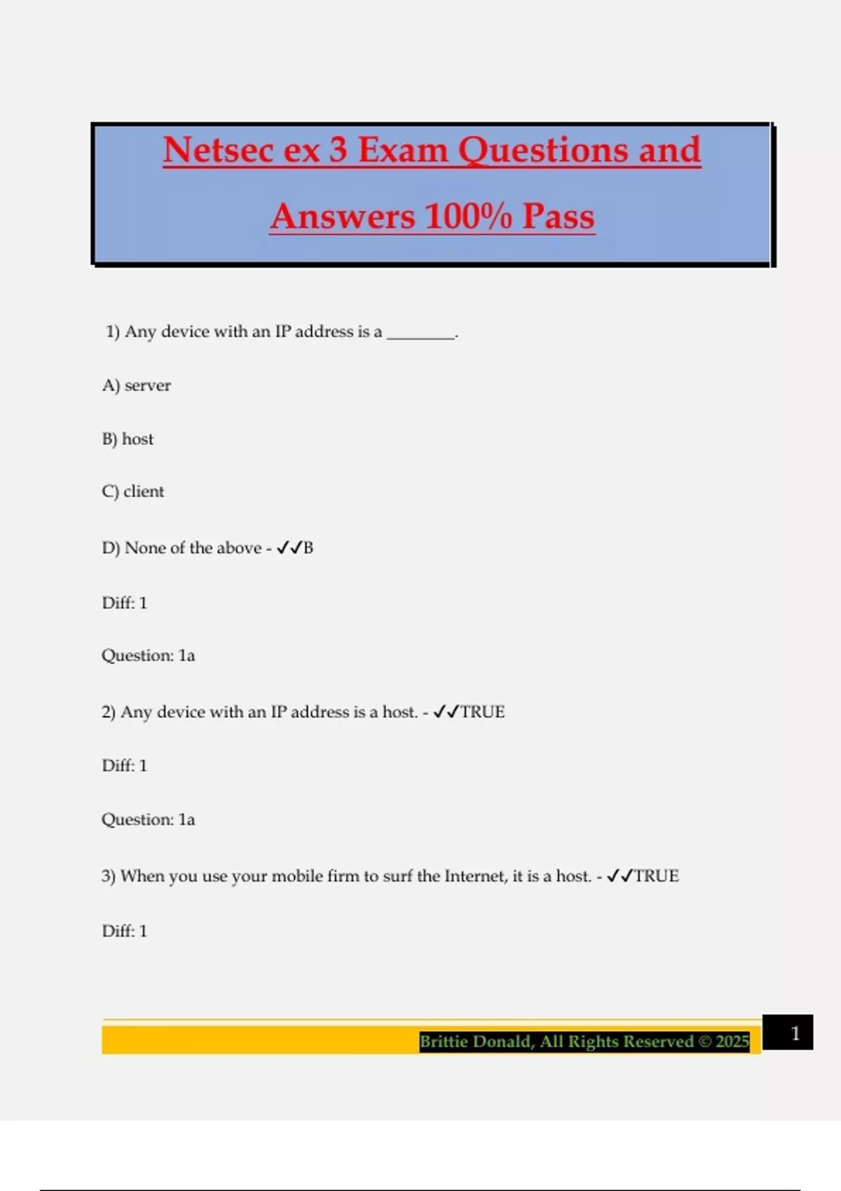 Netsec ex 3 Exam Questions and Answers 100% Pass 1) Any device with an IP address is a ________. A) server B) host C) client D) None of the above - B Diff: 1 Question: 1a 2) Any device with an IP address is a host. - TRUE Diff: 1 Question: 1a 3) When you use your mobile firm to surf the Internet, it is a host. - TRUE Diff: 1 2Brittie Donald, All Rights Reserved © 2025 Question: 1a 4) ________ is necessary to protect the host against attacks. A) Host hardening B) Host bulwarking C) Host shielding D) None of the above - A Diff: 1 Question: 1b 5) If an attacker takes over a firewall, he or she will be able to ________. A) allow connection-opening requests that violate policy B) reroute internal data to alternate paths C) provide the false sense that the firewall is still working correctly D) All of the above - D Diff: 3 Question: 1d 3Brittie Donald, All Rights Reserved © 2025 6) If an attacker takes over a router, he or she will be able to ________. A) map the entire internal network B) reroute traffic to cause a local DoS C) Both A and B D) Neither A nor B - B Diff: 3 Question: 1e 7) Which of the following are elements of host hardening? A) Encrypting data on the host B) Read operating system log files C) Both A and B D) Neither A nor B - C Diff: 2 Question: 1f 8) Which of the following are elements of host hardening? A) Minimizing applications on the host B) Having a good border firewall 4Brittie Donald, All Rights Reserved © 2025 C) Both A and B D) Neither A nor B - A Diff: 2 Question: 1f 9) A company should not replace default passwords during configuration. - FALSE Diff: 1 Question: 1g 10) ________ are sets of specific actions to be taken to harden all hosts of a particular type and of particular versions within each type. A) Processes B) Security baselines C) Procedures D) None of the above - B