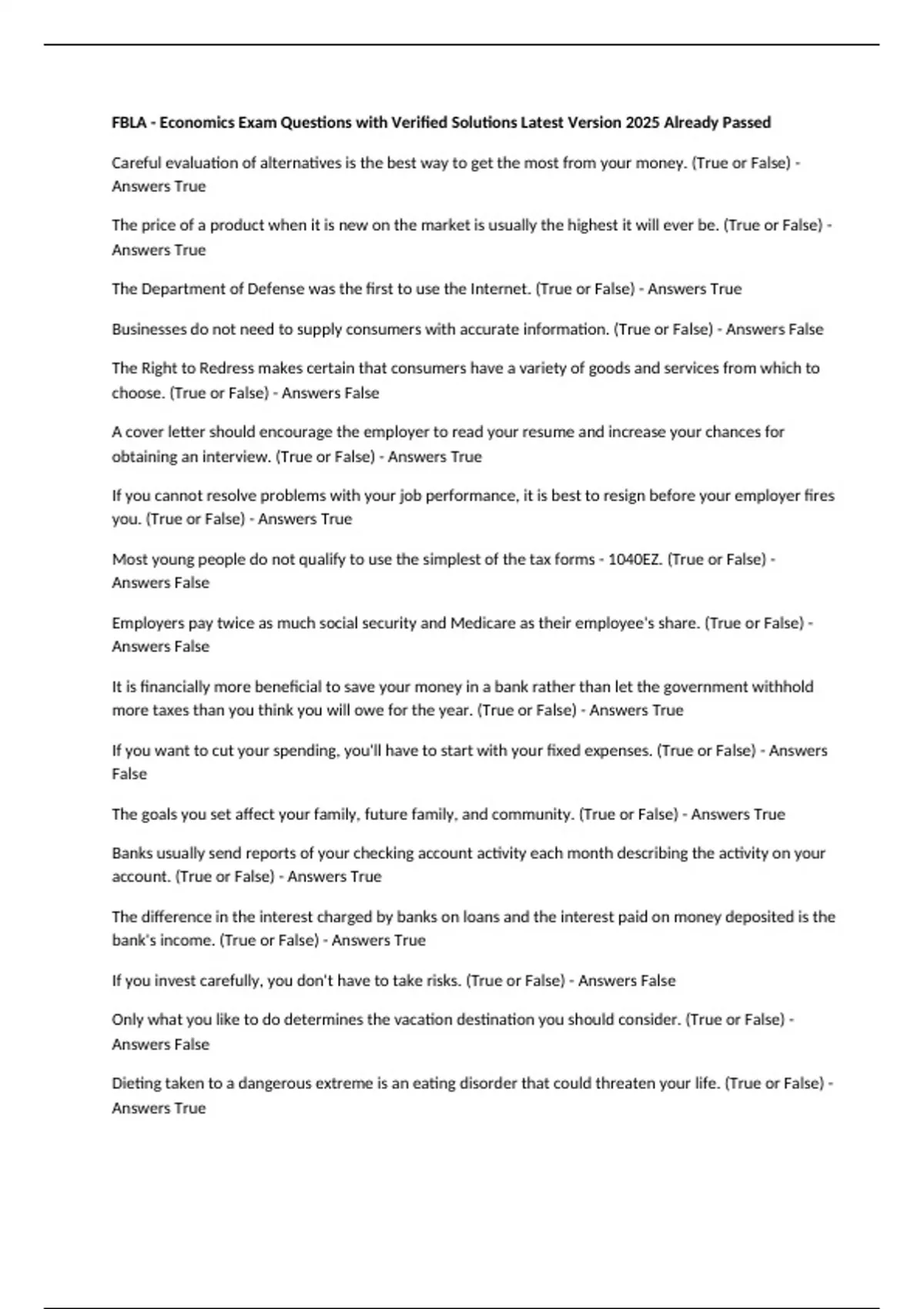 FBLA - Economics Exam Questions with Verified Solutions Latest Version 2025 Already Passed Careful evaluation of alternatives is the best way to get the most from your money. (True or False) - Answers True The price of a product when it is new on the market is usually the highest it will ever be. (True or False) - Answers True The Department of Defense was the first to use the Internet. (True or False) - Answers True Businesses do not need to supply consumers with accurate information. (True or False) - Answers False The Right to Redress makes certain that consumers have a variety of goods and services from which to choose. (True or False) - Answers False A cover letter should encourage the employer to read your resume and increase your chances for obtaining an interview. (True or False) - Answers True If you cannot resolve problems with your job performance, it is best to resign before your employer fires you. (True or False) - Answers True Most young people do not qualify to use the simplest of the tax forms - 1040EZ. (True or False) - Answers False Employers pay twice as much social security and Medicare as their employee's share. (True or False) - Answers False It is financially more beneficial to save your money in a bank rather than let the government withhold more taxes than you think you will owe for the year. (True or False) - Answers True If you want to cut your spending, you'll have to start with your fixed expenses. (True or False) - Answers False The goals you set affect your family, future family, and community. (True or False) - Answers True Banks usually send reports of your checking account activity each month describing the activity on your account. (True or False) - Answers True The difference in the interest charged by banks on loans and the interest paid on money deposited is the bank's income. (True or False) - Answers True If you invest carefully, you don't have to take risks. (True or False) - Answers False Only what you like to do determines the vacation destination you should consider. (True or False) - Answers False Dieting taken to a dangerous extreme is an eating disorder that could threaten your life. (True or False) - Answers True The outpatient portion of a policy covers treatment after you have been admitted to the hospital. (True or False) - Answers False NAFTA requires that tariffs on most goods produced and sold in North America will be gradually increased. (True or False) - Answers False In practice, trade is completely free. (True or False) - Answers False A need is something that you desire to have because someone else has one. (True or False) - Answers False One of the problems in economics is that wants are unlimited. (True or False) - Answers True There are only two kinds of economic resources: human and capital. (True or False) - Answers False Labor is another name for human resources. (True or False) - Answers True Some resources, such as clean air and water, are limited. (True or False) - Answers True Scarcity is a problem that is faced by individuals and businesses but not by governments. (True or False) - Answers False Economic decision making is important to businesses and governments but not to individuals. (True or False) - Answers False Economic decision making is a process requiring four important steps. (True or False) - Answers False An arrangement that allows buyers and sellers to come together to trade goods, services, and resources is called a market. (True or False) - Answers True Determining which of its citizens should benefit from the production of goods and services is something each nation must decide. (True or False) - Answers True When the government hires new employees, it is participating in the marketplace. (True or False) - Answers True In a system of capitalism, the government decides what will be produced with the resources available. (True or False) - Answers False In the private enterprise system, you may start or invest in any business as long it is not illegal to do so. (True or False) - Answers `True The profit motive is designed to allow lazy owners to become rich. (True or False) - Answers False The three roles that everyone must perform are worker, consumer, and saver. (True or False) - Answers False Quantity demanded means the quantity of products and services that consumers are willing and able to buy at a particular price. (True or False) - Answers True
