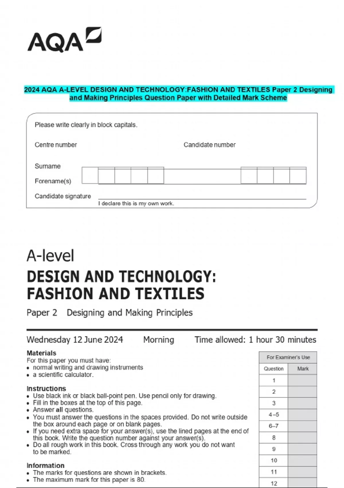 2024 AQA A-LEVEL DESIGN AND TECHNOLOGY:FASHION AND TEXTILES Paper 2 Designing and Making Principles Question Paper with Detailed Mark Scheme