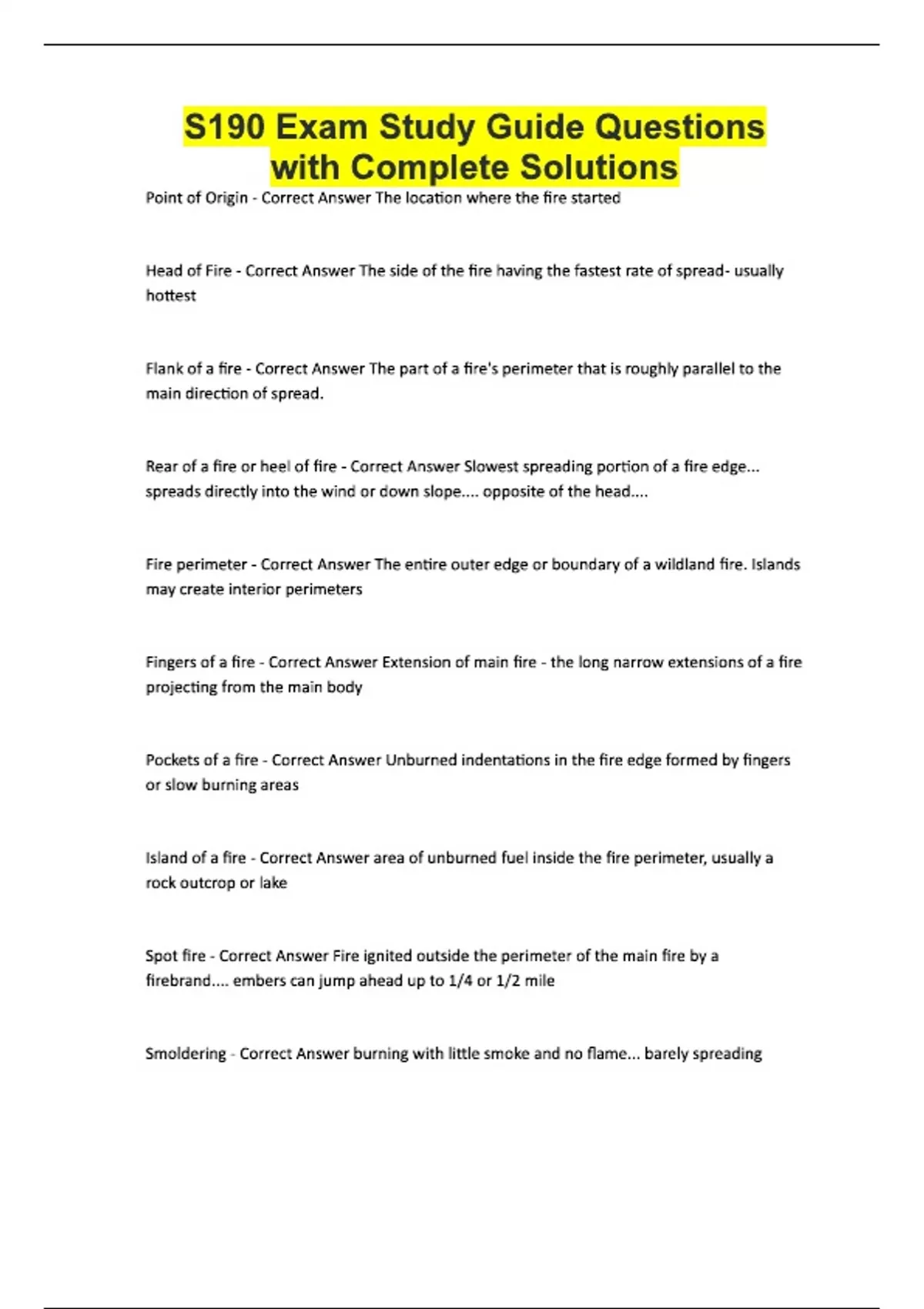 S190 Exam Study Guide Questions with Complete Solutions Point of Origin - Correct Answer The location where the fire started Head of Fire - Correct Answer The side of the fire having the fastest rate of spread- usually hottest Flank of a fire - Correct Answer The part of a fire's perimeter that is roughly parallel to the main direction of spread. Rear of a fire or heel of fire - Correct Answer Slowest spreading portion of a fire edge... spreads directly into the wind or down slope.... opposite of the head.... Fire perimeter - Correct Answer The entire outer edge or boundary of a wildland fire. Islands may create interior perimeters Fingers of a fire - Correct Answer Extension of main fire - the long narrow extensions of a fire projecting from the main body Pockets of a fire - Correct Answer Unburned indentations in the fire edge formed by fingers or slow burning areas Island of a fire - Correct Answer area of unburned fuel inside the fire perimeter, usually a rock outcrop or lake Spot fire - Correct Answer Fire ignited outside the perimeter of the main fire by a firebrand.... embers can jump ahead up to 1/4 or 1/2 mile Smoldering - Correct Answer burning with little smoke and no flame... barely spreading