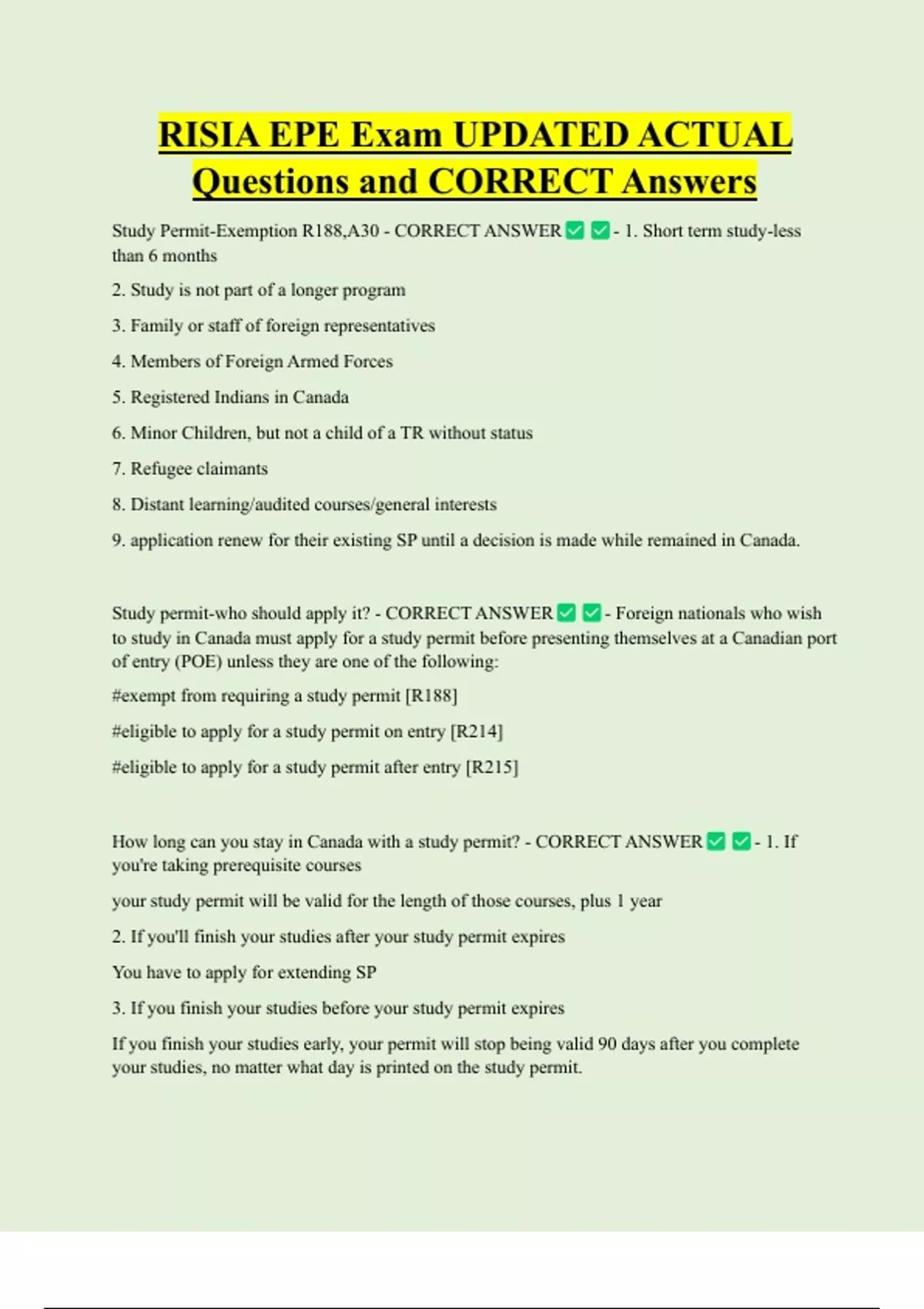 Study Permit-Exemption R188,A30 - CORRECT ANSWER - 1. Short term study-less