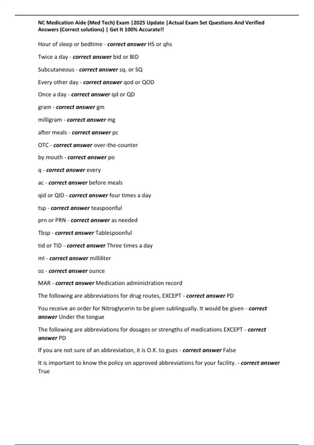, NC Medication Aide (Med Tech) Exam |2025 Update |Actual Exam Set Questions And Verified