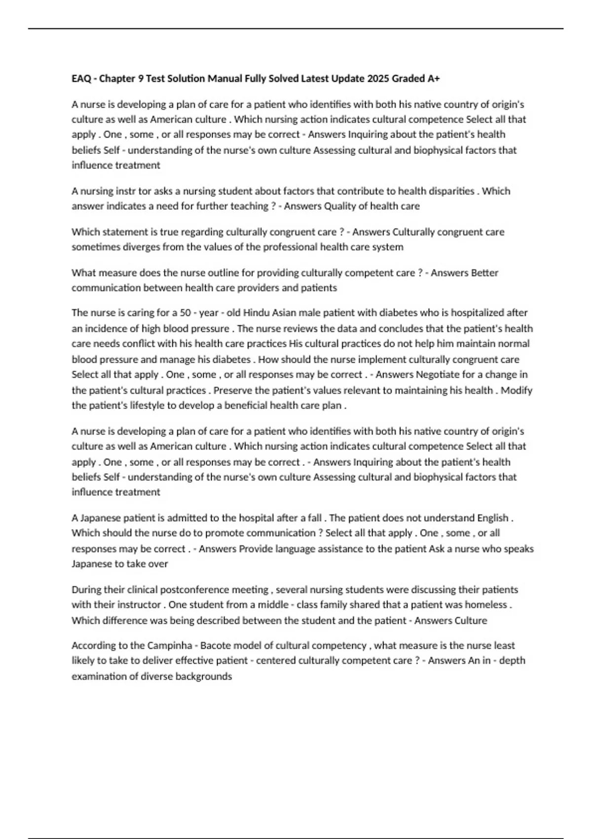 culture as well as American culture . Which nursing action indicates cultural competence Select all that