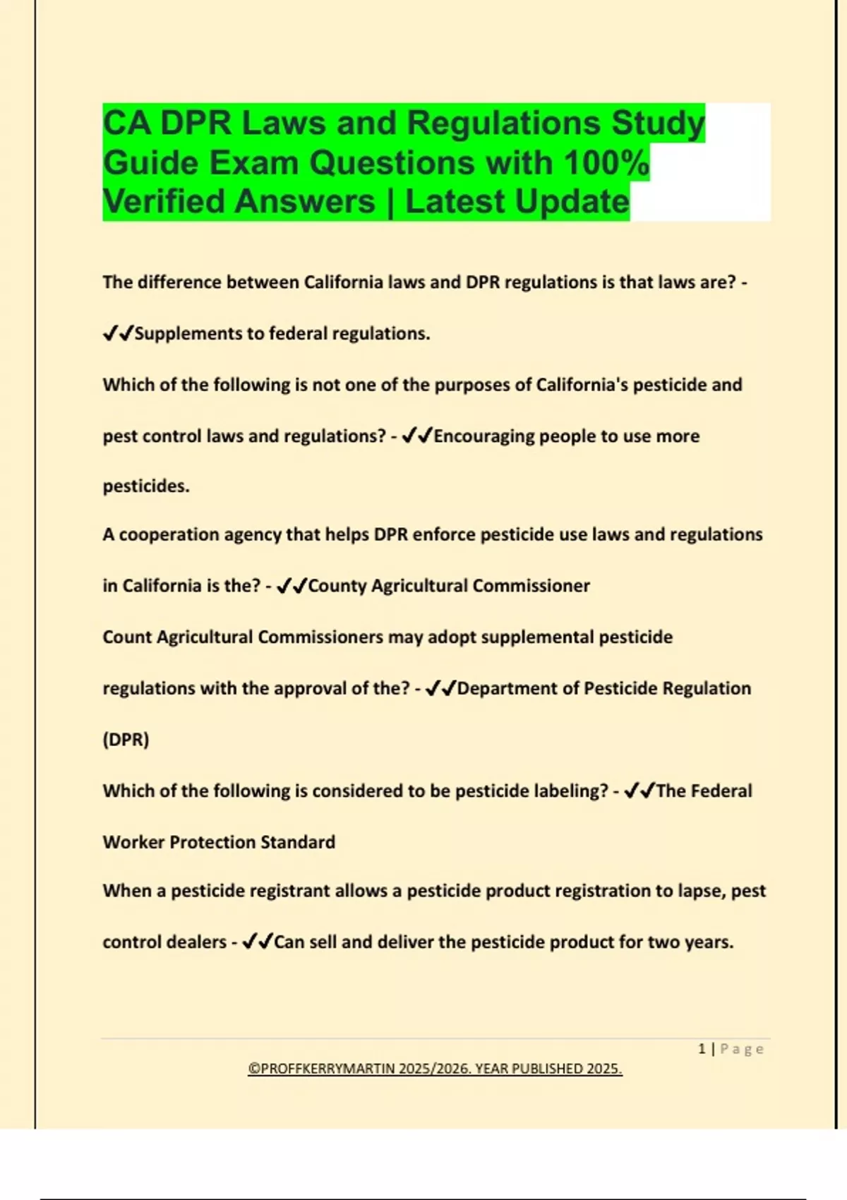 CA DPR Laws and Regulations Study Guide Exam Questions with 100% Verified Answers | Latest Update The difference between California laws and DPR regulations is that laws are? - Supplements to federal regulations. Which of the following is not one of the purposes of California's pesticide and pest control laws and regulations? - Encouraging people to use more pesticides. A cooperation agency that helps DPR enforce pesticide use laws and regulations in California is the? - County Agricultural Commissioner Count Agricultural Commissioners may adopt supplemental pesticide regulations with the approval of the? - Department of Pesticide Regulation (DPR) Which of the following is considered to be pesticide labeling? - The Federal Worker Protection Standard When a pesticide registrant allows a pesticide product registration to lapse, pest control dealers - Can sell and deliver the pesticide product for two years.