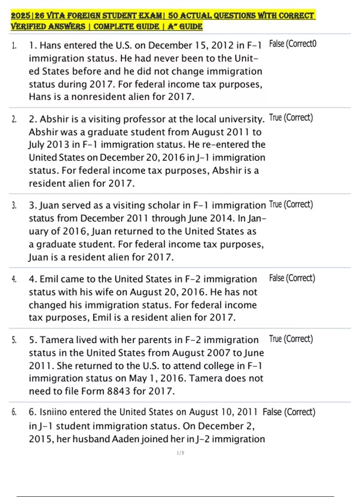 , 2025|26 VITA FOREIGN STUDENT EXAM| 50 ACTUAL QUESTIONS WITH CORRECT