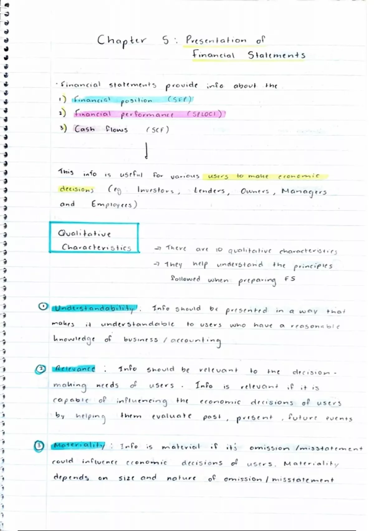 These notes contain everything you will need to know from Chapter 5; Presentation of financial statements. The 10 qualitative characteristics are explained in great detail as well as how each financial statement connects to each other. The statement of profit or loss, statement of changes in equity, statement of financial position and other notes are included and explained in an easy to understand way.