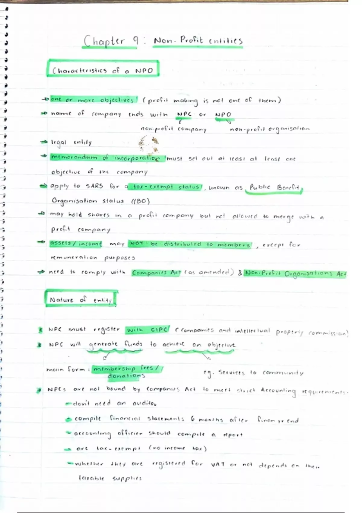 These notes explain everything you will need to know from Chapter 9; Non-profit entities. Theory such as characteristics of a NPO and nature of a NPO are included as well as how to record different funds. These notes also go into depth about membership fees, what they are and a step by step method of how to record them with practical examples.