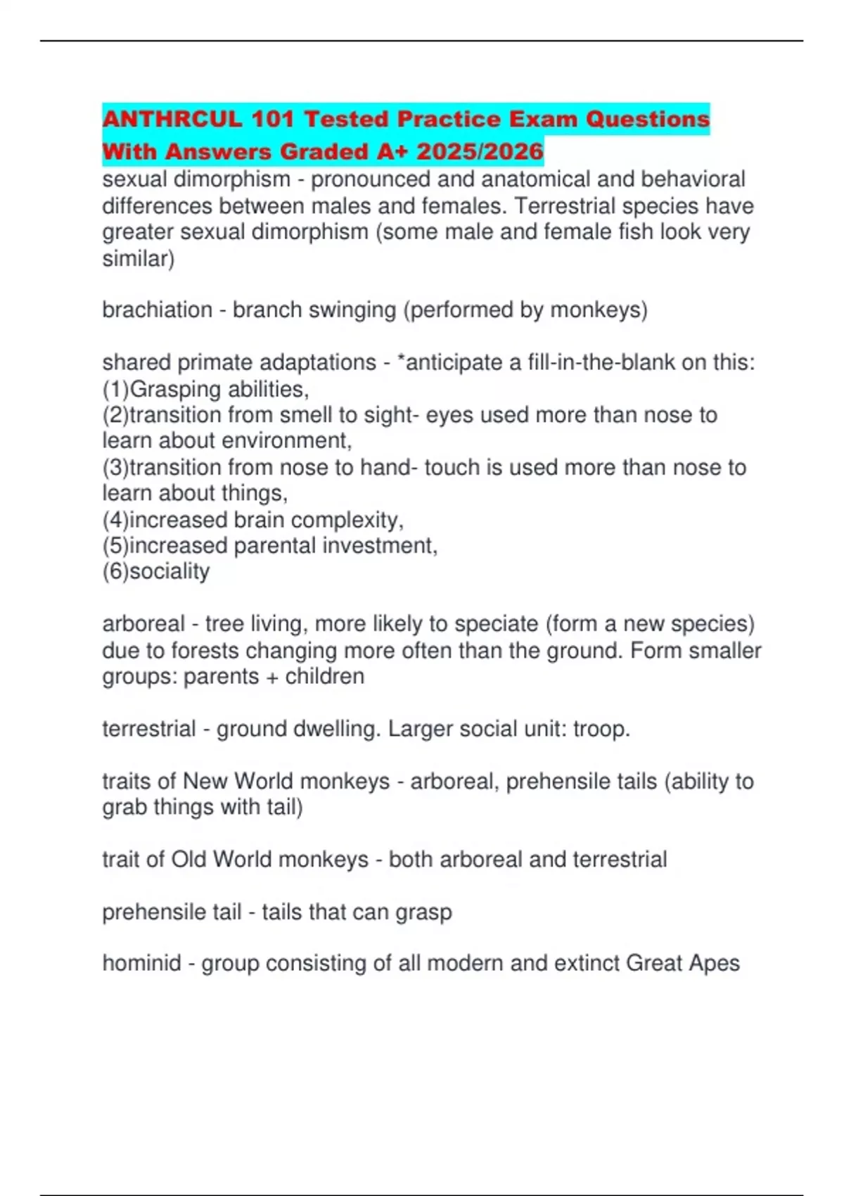 shared primate adaptations - *anticipate a fill-in-the-blank on this:
