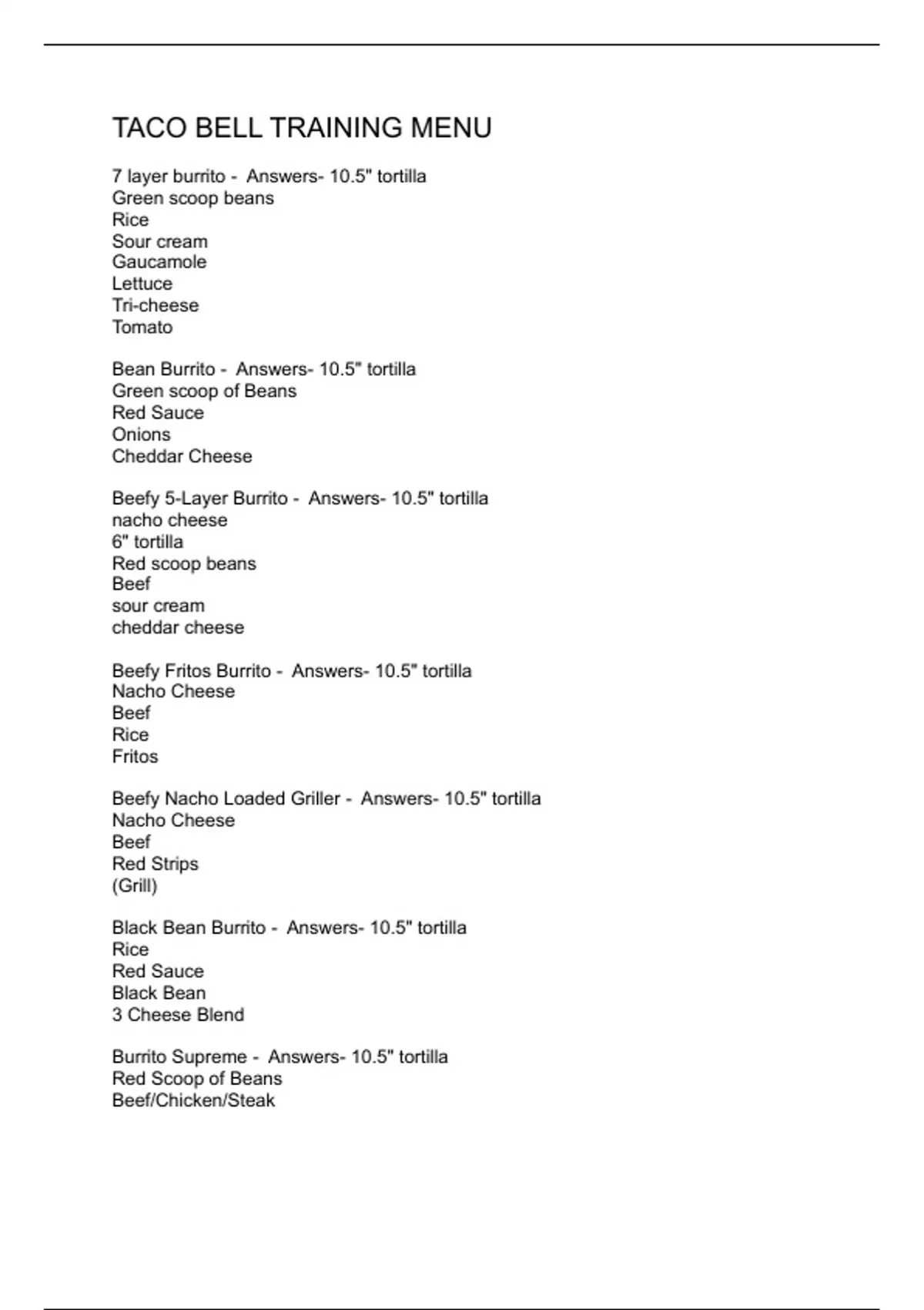 TACO BELL TRAINING MENU