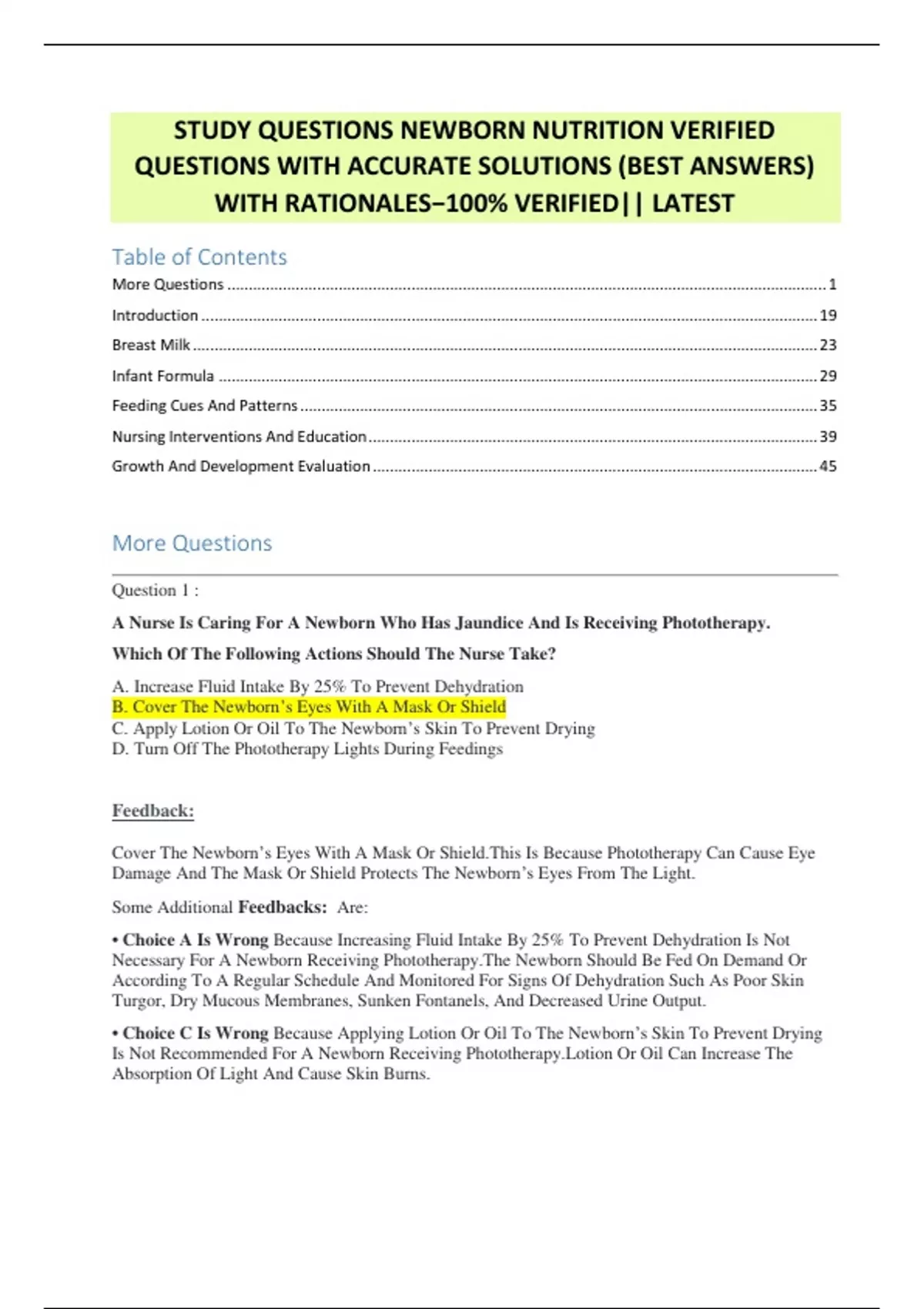 STUDY QUESTIONS NEWBORN NUTRITION VERIFIED QUESTIONS WITH ACCURATE SOLUTIONS (BEST ANSWERS) WITH RATIONALES−100% VERIFIED|| LATEST