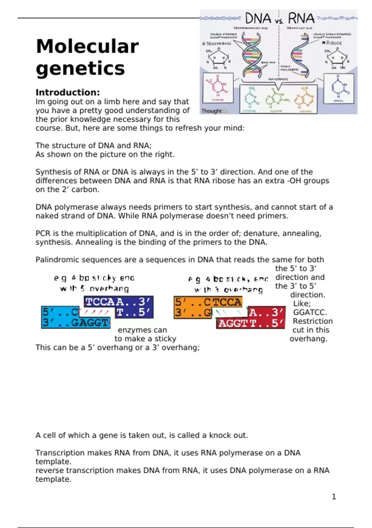 This is a summary for the Molecular Genetics course in the second year of the Biology program provided by the RuG. In this summary the entire course is explained in such a way that makes the material easy to understand. I passed this course using only my summary, and I hope you will too!