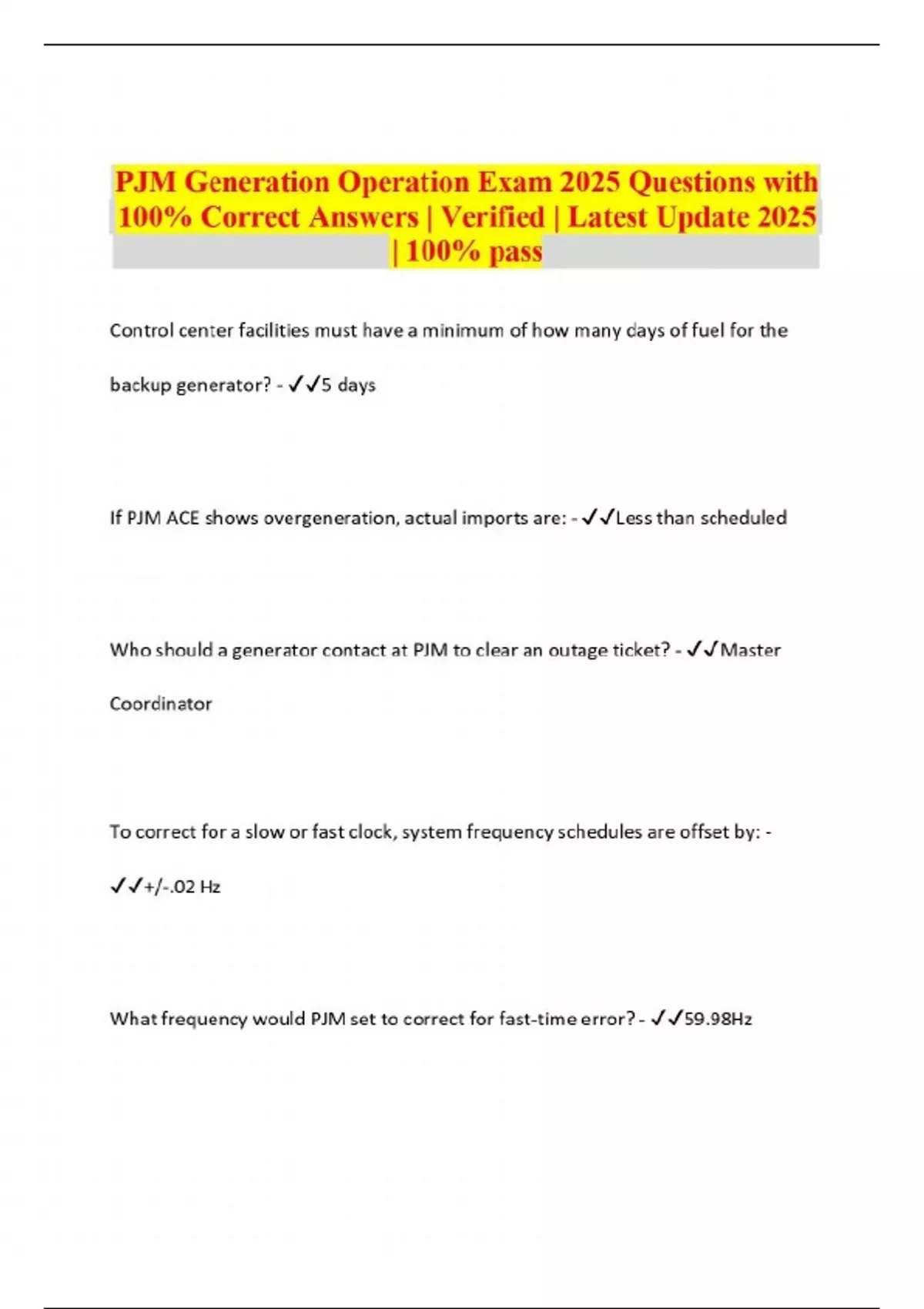 PJM Generation Operation Exam 2025 Questions with 100% Correct Answers | Verified | Latest Update 2025 | 100% pass