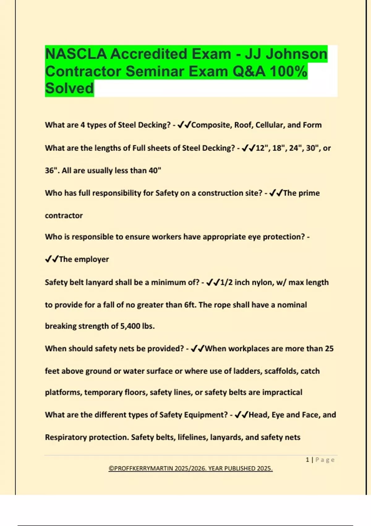 NASCLA Accredited Exam - JJ Johnson Contractor Seminar Exam Q&A 100% Solved What are 4 types of Steel Decking? - Composite, Roof, Cellular, and Form What are the lengths of Full sheets of Steel Decking? - 12", 18", 24", 30", or 36". All are usually less than 40" Who has full responsibility for Safety on a construction site? - The prime contractor Who is responsible to ensure workers have appropriate eye protection? - The employer Safety belt lanyard shall be a minimum of? - 1/2 inch nylon, w/ max length to provide for a fall of no greater than 6ft. The rope shall have a nominal breaking strength of 5,400 lbs. When should safety nets be provided? - When workplaces are more than 25 feet above ground or water surface or where use of ladders, scaffolds, catch platforms, temporary floors, safety lines, or safety belts are impractical What are the different types of Safety Equipment? - Head, Eye and Face, and Respiratory protection. Safety belts, lifelines, lanyards, and safety nets