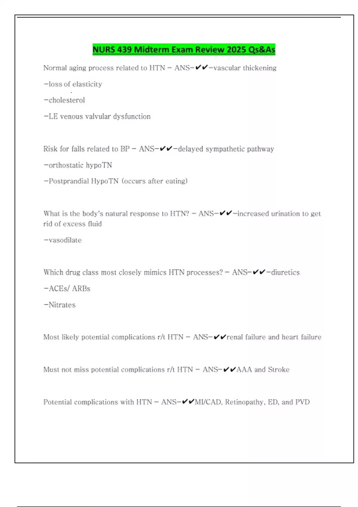 NURS 439 Midterm Exam Review 2025 Qs&As Normal aging process related to HTN - ANS--vascular thickening -loss of elasticity -cholesterol -LE venous valvular dysfunction Risk for falls related to BP - ANS--delayed sympathetic pathway -orthostatic hypoTN -Postprandial HypoTN (occurs after eating) What is the body's natural response to HTN? - ANS--increased urination to get rid of excess fluid -vasodilate Which drug class most closely mimics HTN processes? - ANS--diuretics -ACEs/ ARBs -Nitrates Most likely potential complications r/t HTN - ANS-