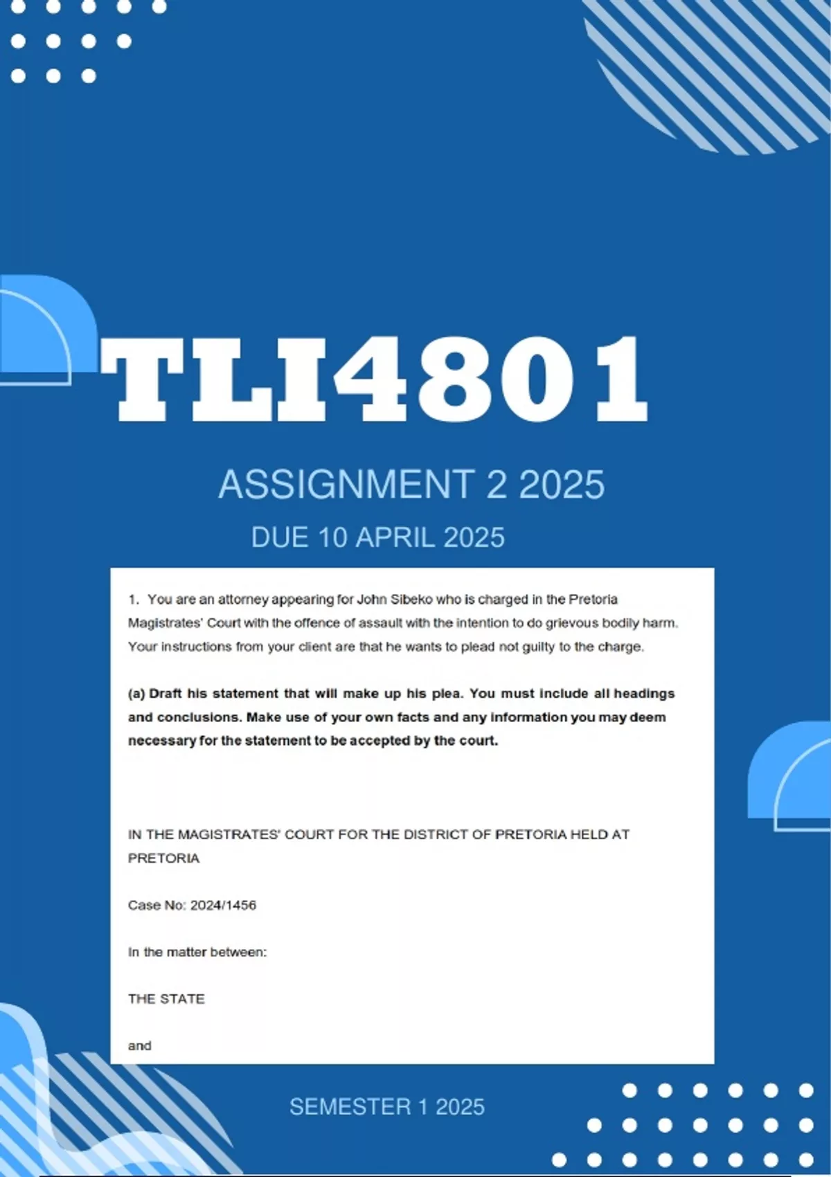 Assignment 02 – Semester 1 2025 Answer the following questions using proper references. Your entire assignment answer (questions 1 (a)-(d)) must be typed and must not exceed 15 pages. 1. You are an attorney appearing for John Sibeko who is charged in the Pretoria Magistrates’ Court with the offence of assault with the intention to do grievous bodily harm. Your instructions from your client are that he wants to plead not guilty to the charge. (a) Draft his statement that will make up his plea. You must include all headings and conclusions. Make use of your own facts and any information you may deem necessary for the statement to be accepted by the court. IN THE MAGISTRATES' COURT FOR THE DISTRICT OF PRETORIA HELD AT PRETORIA Case No: 2024/1456 In the matter between: THE STATE and