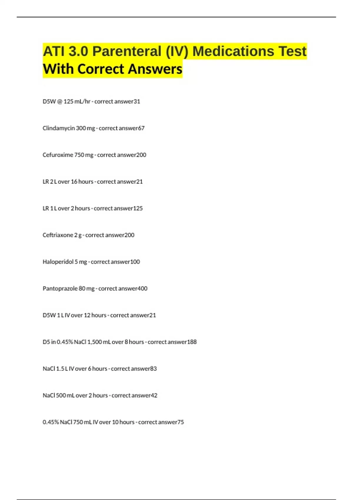 ATI 3.0 Parenteral (IV) Medications Test With Correct Answers