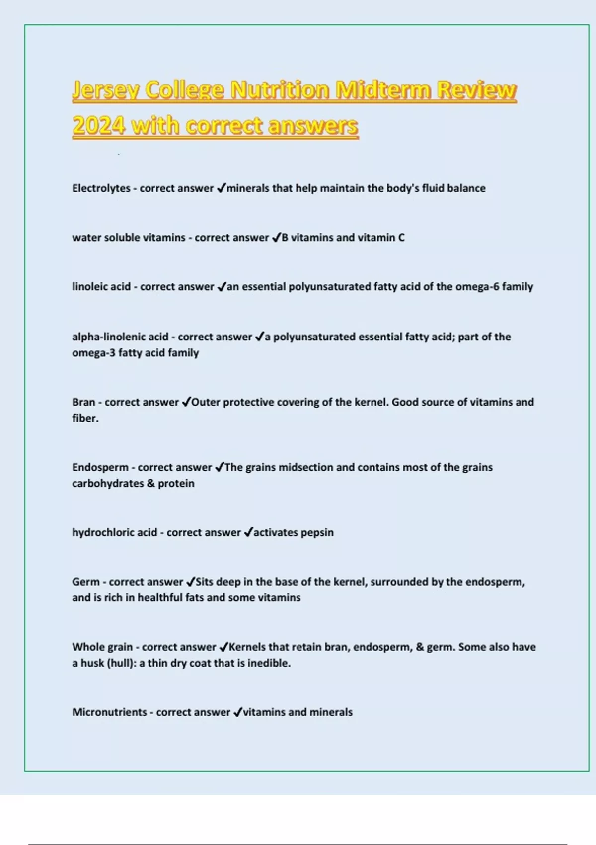 Jersey College Nutrition Midterm Review 2024 with correct answers
