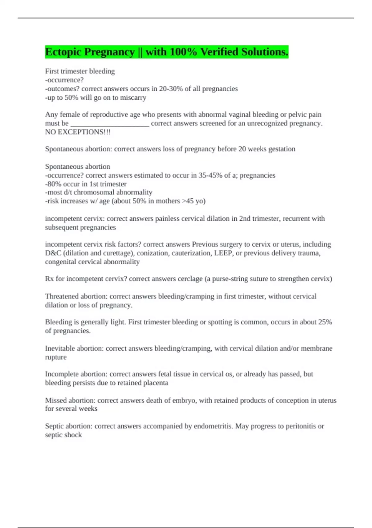 First trimester bleeding -occurrence? -outcomes? correct answers occurs in 20-30% of all pregnancies -up to 50% will go on to miscarry Any female of reproductive age who presents with abnormal vaginal bleeding or pelvic pain must be _____________________ correct answers screened for an unrecognized pregnancy. NO EXCEPTIONS!!! Spontaneous abortion: correct answers loss of pregnancy before 20 weeks gestation Spontaneous abortion -occurrence? correct answers estimated to occur in 35-45% of a; pregnancies -80% occur in 1st trimester -most d/t chromosomal abnormality -risk increases w/ age (about 50% in mothers >45 yo) incompetent cervix: correct answers painless cervical dilation in 2nd trimester, recurrent with subsequent pregnancies incompetent cervix risk factors? correct answers Previous surgery to cervix or uterus, including D&C (dilation and curettage), conization, cauterization, LEEP, or previous delivery trauma, congenital cervical abnormality Rx for incompetent cervix? correct answers cerclage (a purse-string suture to strengthen cervix) Threatened abortion: correct answers bleeding/cramping in first trimester, without cervical dilation or loss of pregnancy. Bleeding is generally light. First trimester bleeding or spotting is common, occurs in about 25% of pregnancies. Inevitable abortion: correct answers bleeding/cramping, with cervical dilation and/or membrane rupture Incomplete abortion: correct answers fetal tissue in cervical os, or already has passed, but bleeding persists due to retained placenta Missed abortion: correct answers death of embryo, with retained products of conception in uterus for several weeks Septic abortion: correct answers accompanied by endometritis. May progress to peritonitis or septic shock