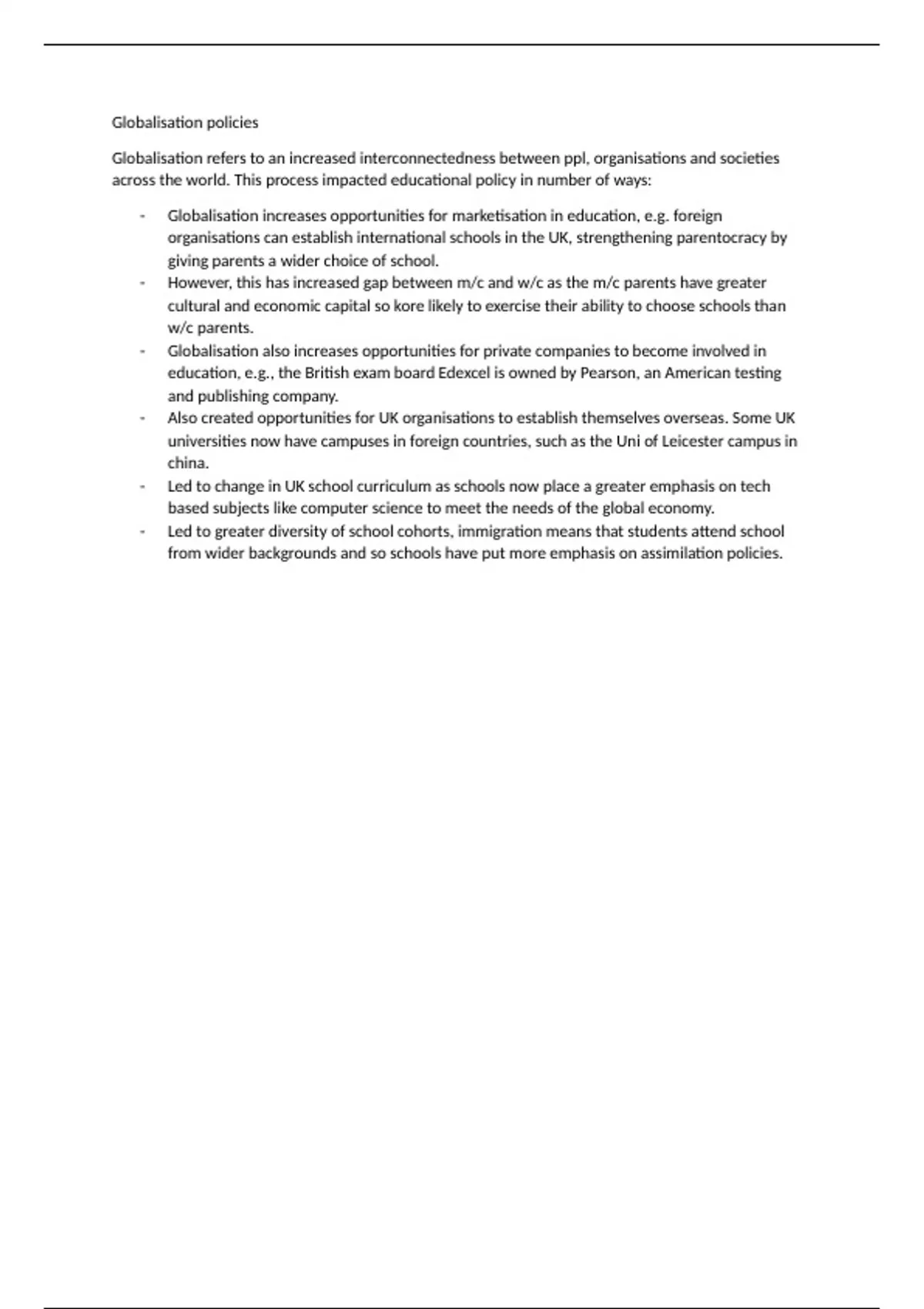 - Globalisation increases opportunities for marketisation in education, e.g. foreign