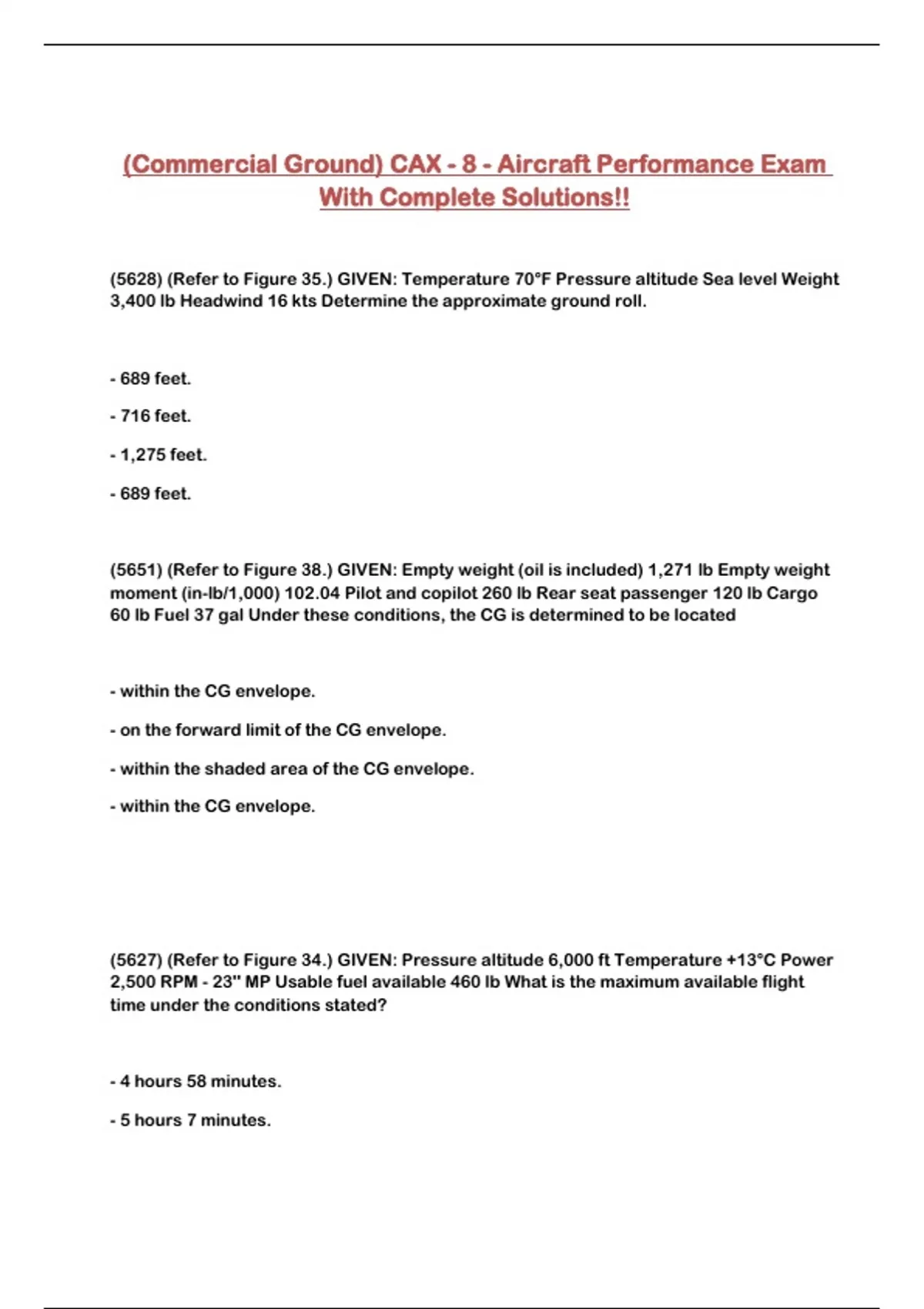 (Commercial Ground) CAX - 8 - Aircraft Performance Exam With Complete Solutions!!...