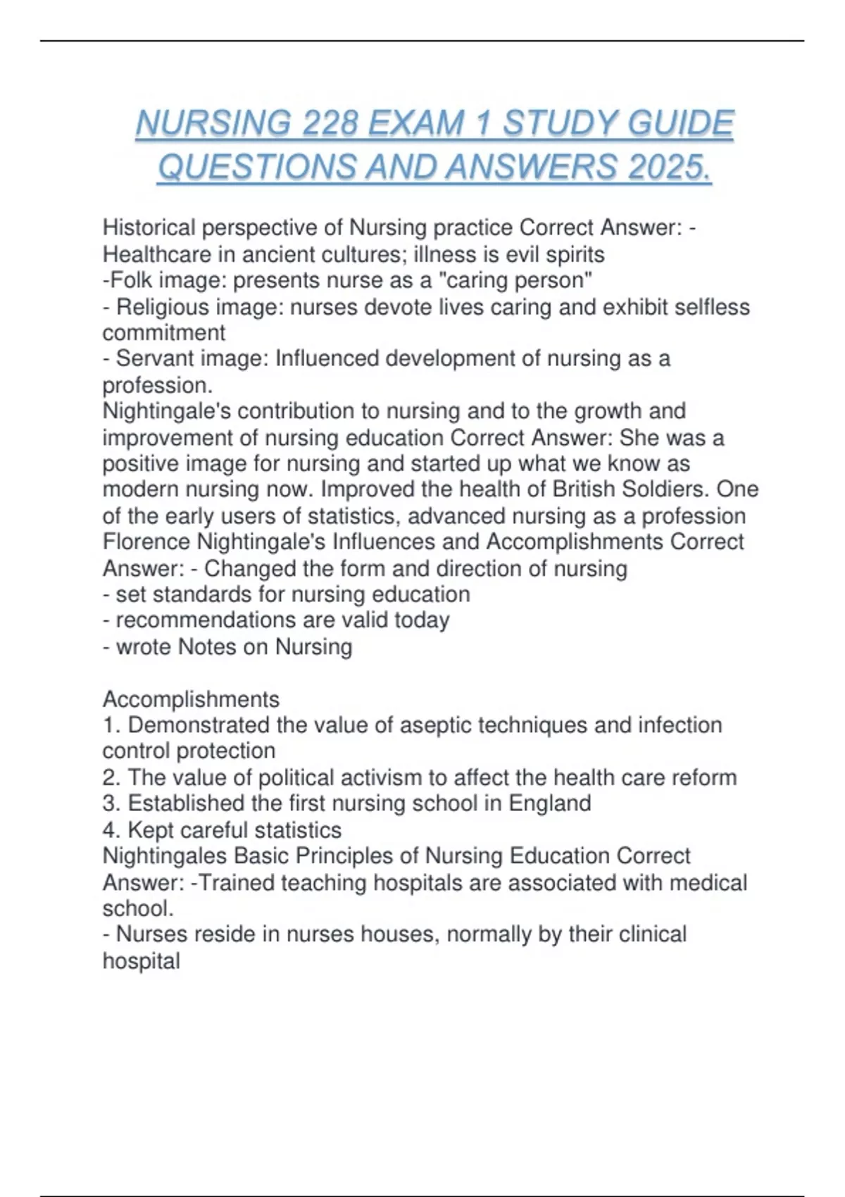 NURSING 228 EXAM 1 STUDY GUIDE QUESTIONS AND ANSWERS 2025 NURSING 228 EXAM 1 STUDY GUIDE QUESTIONS AND ANSWERS 2025