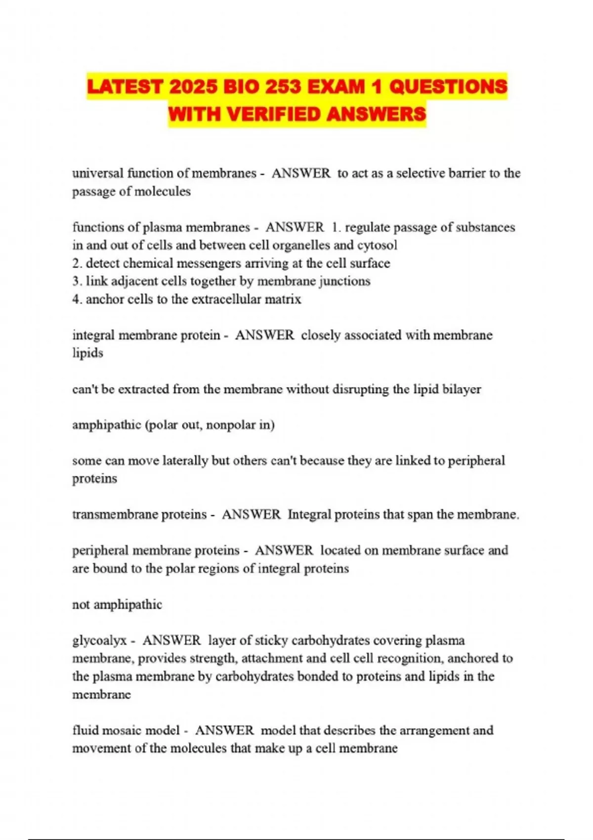 LATEST 2025 BIO 253 EXAM 1 QUESTIONS WITH VERIFIED ANSWERS...