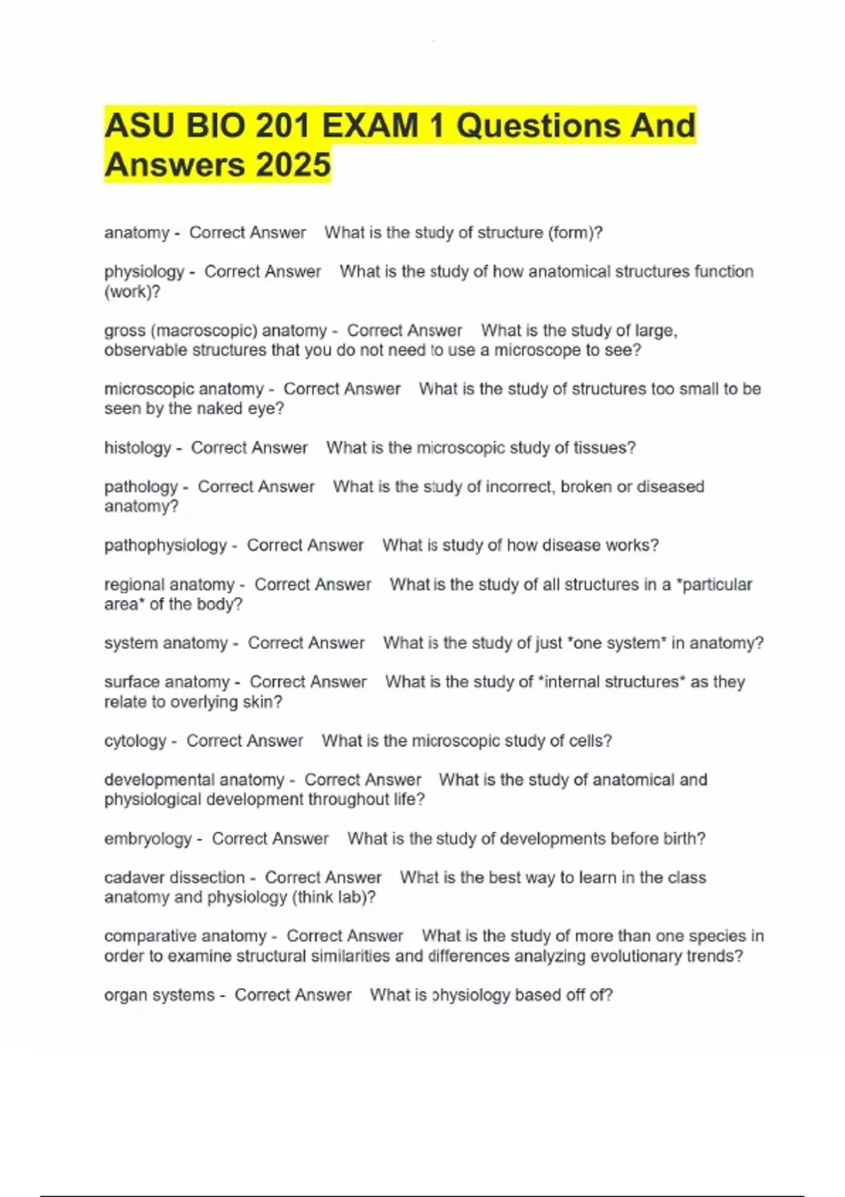 ASU BIO 201 EXAM 1 Questions And Answers 2025 anatomy - Correct Answer What is the study of structure (form)? physiology - Correct Answer What is the study of how anatomical structures function (work)? gross (macroscopic) anatomy - Correct Answer What is the study of large, observable structures that you do not need to use a microscope to see? microscopic anatomy - Correct Answer What is the study of structures too small to be seen by the naked eye? histology - Correct Answer What is the microscopic study of tissues? pathology - Correct Answer What is the study of incorrect, broken or diseased anatomy? pathophysiology - Correct Answer What is study of how disease works? regional anatomy - Correct Answer What is the study of all structures in a *particular area* of the body? system anatomy - Correct Answer What is the study of just *one system* in anatomy? surface anatomy - Correct Answer What is the study of *internal structures* as they relate to overlying skin? cytology - Correct Answer What is the microscopic study of cells? developmental anatomy - Correct Answer What is the study of anatomical and physiological development throughout life? embryology - Correct Answer What is the study of developments before birth? cadaver dissection - Correct Answer What is the best way to learn in the class anatomy and physiology (think lab)? comparative anatomy - Correct Answer What is the study of more than one species in order to examine structural similarities and differences analyzing evolutionary trends? organ systems - Correct Answer What is physiology based off of? anatomical position - Correct Answer body erect, feet slightly apart, palms facing forward with thumbs pointing away from body directional terms - Correct Answer What describe one body structure in relation to another body structure? true - Correct Answer T/F: right and left refer to the *body being viewed* not right and left of the observer superior (cranial) - Correct Answer directional term: toward the head end/upper part of a structure/body *ABOVE* cranial - Correct Answer What is another term used to refer to the superior directional term? inferior (caudal) - Correct Answer directional term: away from the head end/toward lower part of a structure of the body *BELOW* caudal - Correct Answer What is another term used to refer to the inferior directional term? anterior (ventral) - Correct Answer directional term: toward/ at the front of the body *IN FRONT OF* ventral - Correct Answer What is another term used to refer the anterior directional term? posterior (dorsal) - Correct Answer directional term: toward/ at th