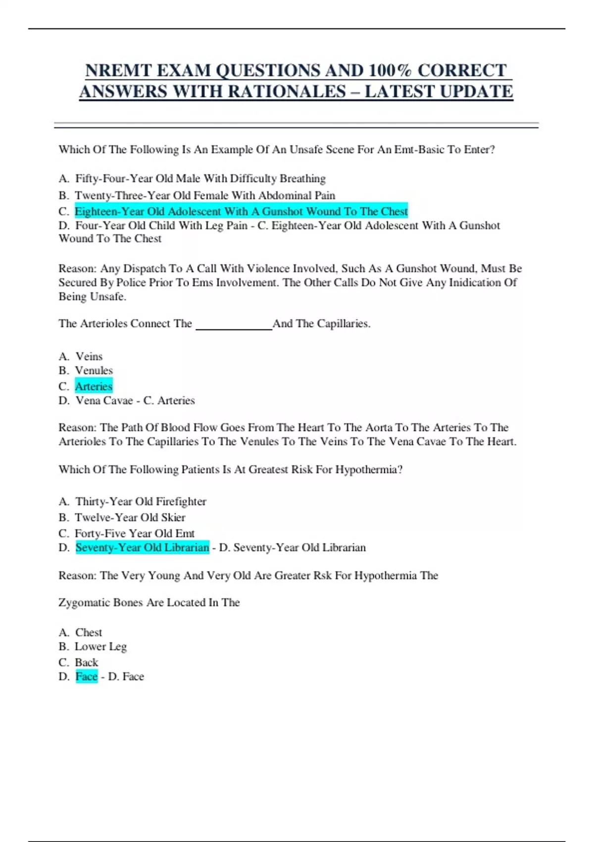 NREMT EXAM QUESTIONS AND 100% CORRECT ANSWERS WITH RATIONALES – LATEST UPDATE Which Of The Following Is An Example Of An Unsafe Scene For An Emt-Basic To Enter? A. Fifty-Four-Year Old Male With Difficulty Breathing B. Twenty-Three-Year Old Female With Abdominal Pain C. Eighteen-Year Old Adolescent With A Gunshot Wound To The Chest D. Four-Year Old Child With Leg Pain - C. Eighteen-Year Old Adolescent With A Gunshot Wound To The Chest Reason: Any Dispatch To A Call With Violence Involved, Such As A Gunshot Wound, Must Be Secured By Police Prior To Ems Involvement. The Other Calls Do Not Give Any Inidication Of Being Unsafe.