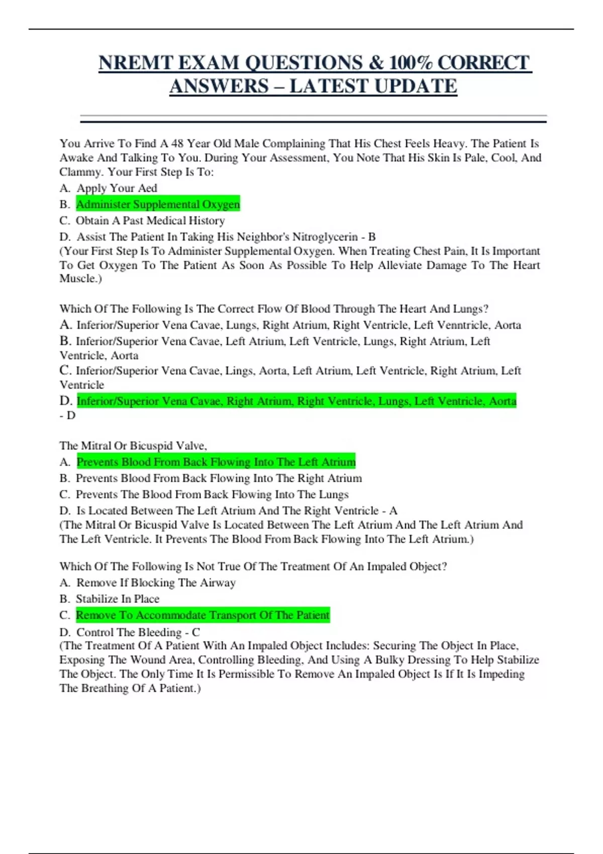 NREMT EXAM QUESTIONS & 100% CORRECT ANSWERS – LATEST UPDATE You Arrive To Find A 48 Year Old Male Complaining That His Chest Feels Heavy. The Patient Is Awake And Talking To You. During Your Assessment, You Note That His Skin Is Pale, Cool, And Clammy. Your First Step Is To: A. Apply Your Aed B. Administer Supplemental Oxygen C. Obtain A Past Medical History D. Assist The Patient In Taking His Neighbor's Nitroglycerin - B (Your First Step Is To Administer Supplemental Oxygen. When Treating Chest Pain, It Is Important To Get Oxygen To The Patient As Soon As Possible To Help Alleviate Damage To The Heart Muscle.)