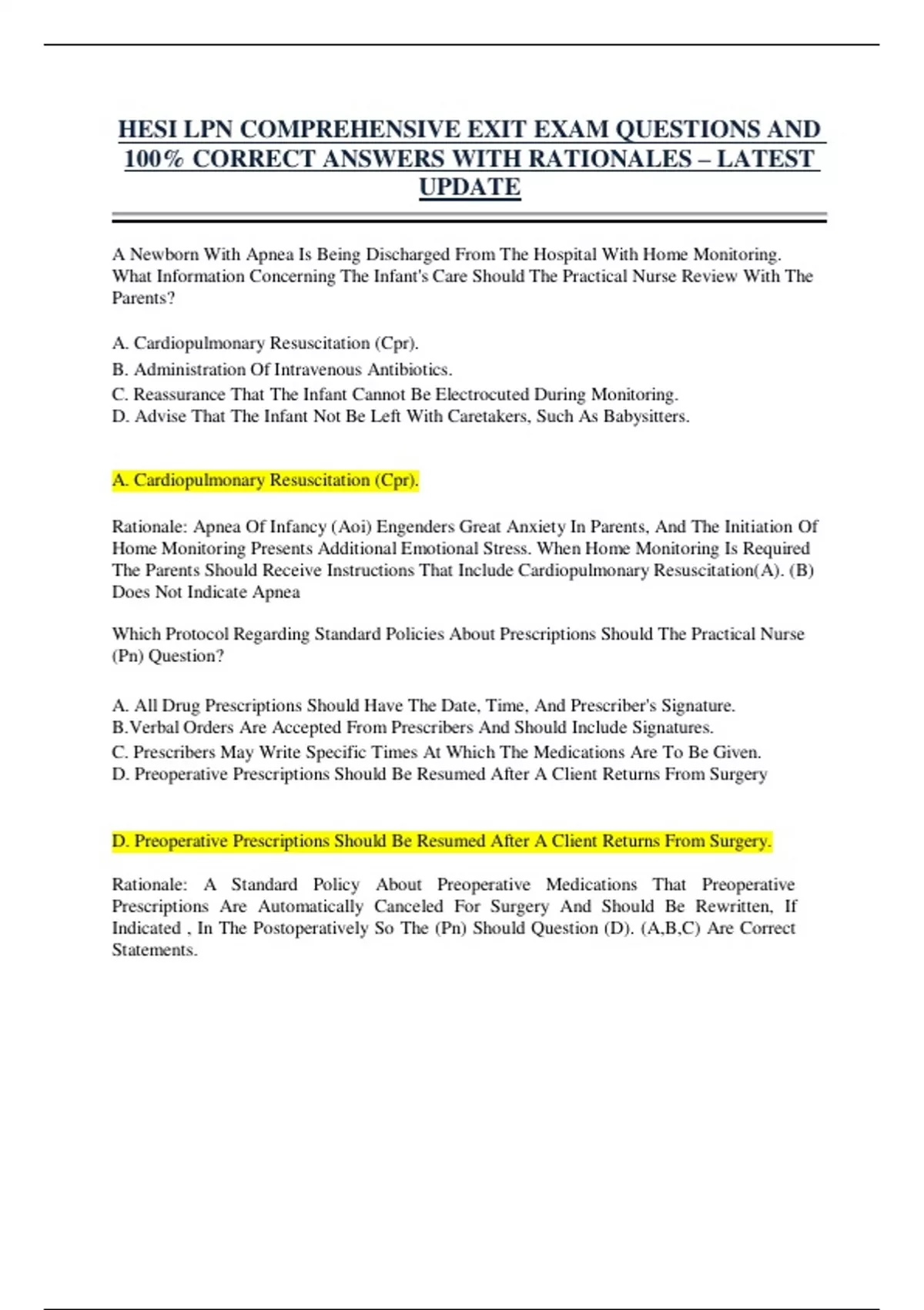 HESI LPN COMPREHENSIVE EXIT EXAM QUESTIONS AND 100% CORRECT ANSWERS WITH RATIONALES – LATEST UPDATE A Newborn With Apnea Is Being Discharged From The Hospital With Home Monitoring. What Information Concerning The Infant's Care Should The Practical Nurse Review With The Parents? A. Cardiopulmonary Resuscitation (Cpr). B. Administration Of Intravenous Antibiotics. C. Reassurance That The Infant Cannot Be Electrocuted During Monitoring. D. Advise That The Infant Not Be Left With Caretakers, Such As Babysitters. A. Cardiopulmonary Resuscitation (Cpr)