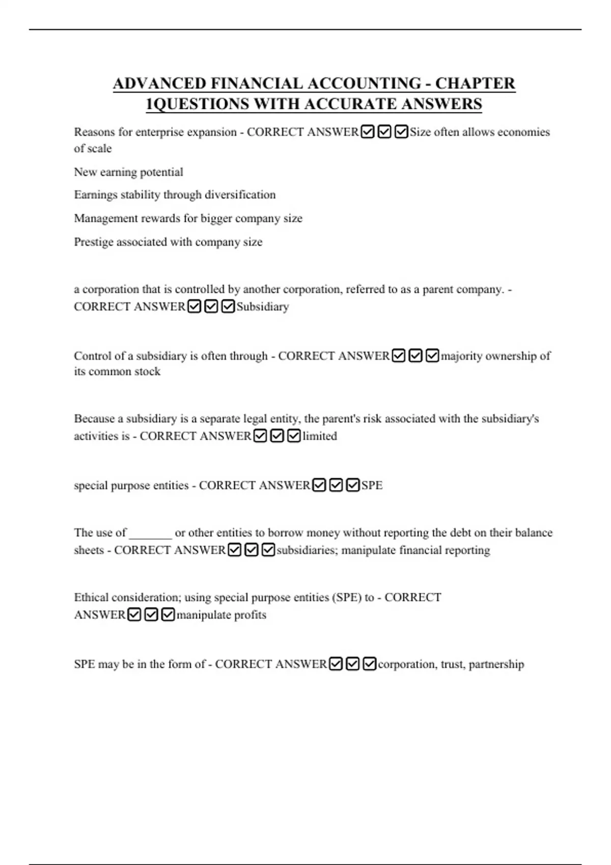 ADVANCED FINANCIAL ACCOUNTING - CHAPTER 1QUESTIONS WITH ACCURATE ANSWERS Reasons for enterprise expansion - CORRECT ANSWERSize often allows economies of scale New earning potential Earnings stability through diversification Management rewards for bigger company size Prestige associated with company size
