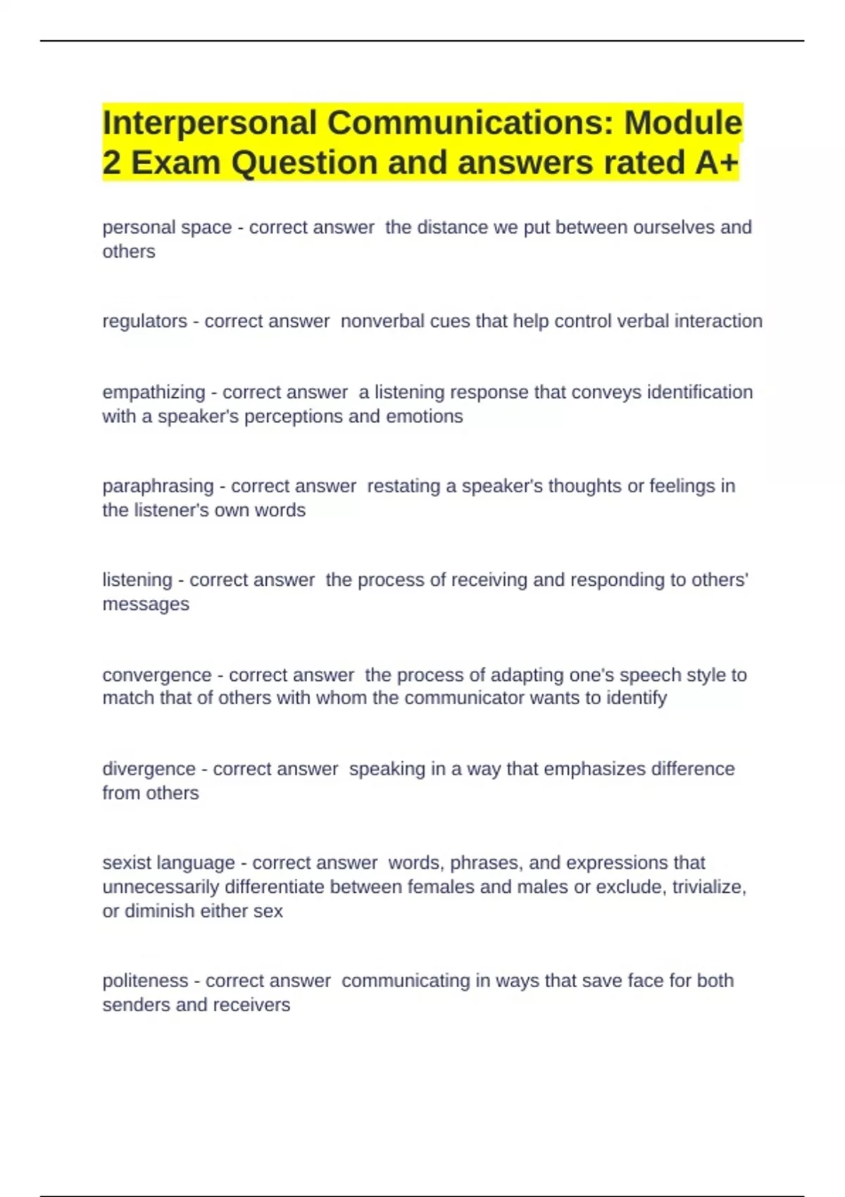 Interpersonal Communications: Module 2 Exam Question and answers rated A+ personal space - correct answer the distance we put between ourselves and others regulators - correct answer nonverbal cues that help control verbal interaction empathizing - correct answer a listening response that conveys identification with a speaker's perceptions and emotions paraphrasing - correct answer restating a speaker's thoughts or feelings in the listener's own words listening - correct answer the process of receiving and responding to others' messages convergence - correct answer the process of adapting one's speech style to match that of others with whom the communicator wants to identify divergence - correct answer speaking in a way that emphasizes difference from others sexist language - correct answer words, phrases, and expressions that unnecessarily differentiate between females and males or exclude, trivialize, or diminish either sex politeness - correct answer communicating in ways that save face for both senders and receiv