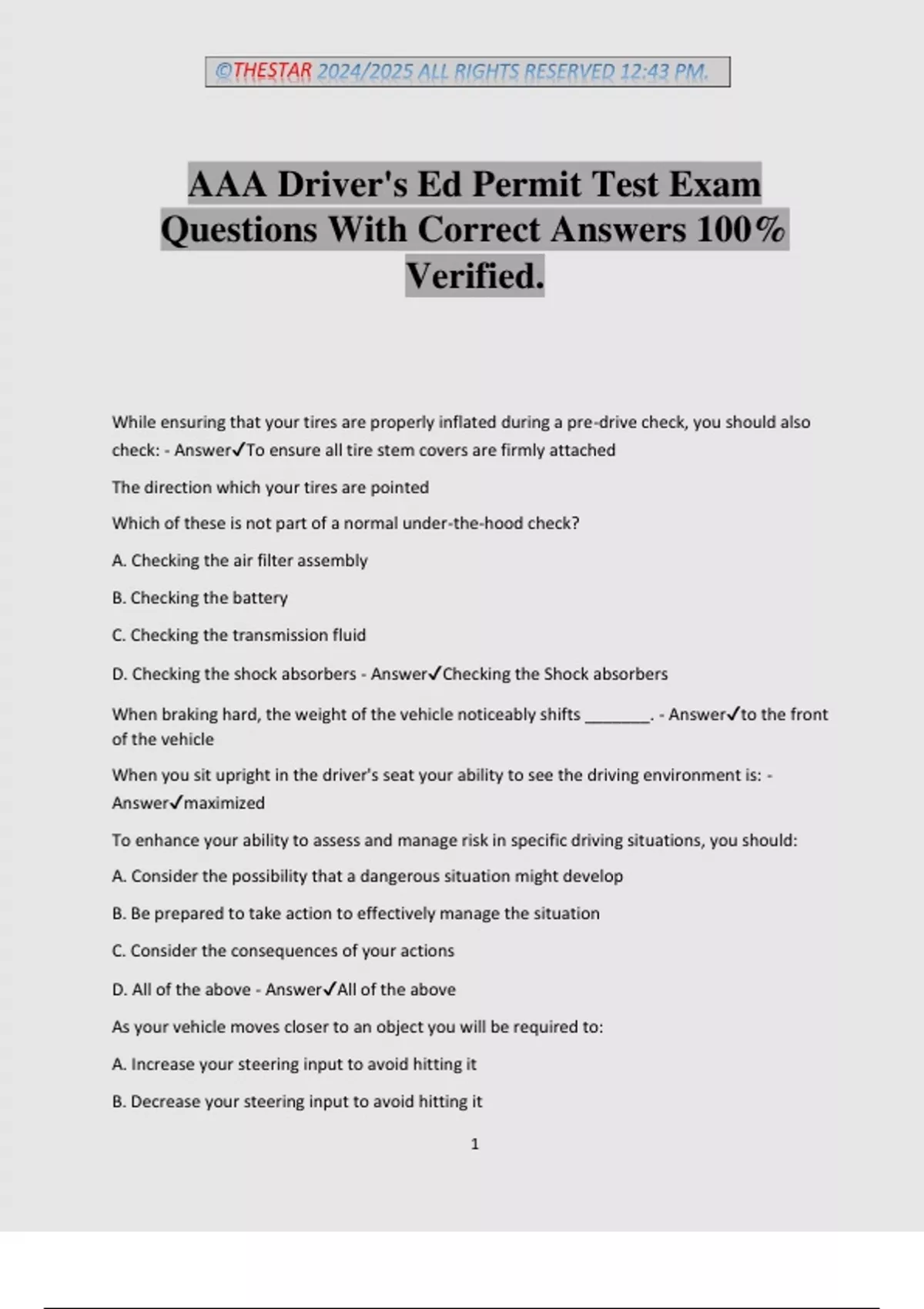 D. Checking the shock absorbers - Answer✔Checking the Shock absorbers
