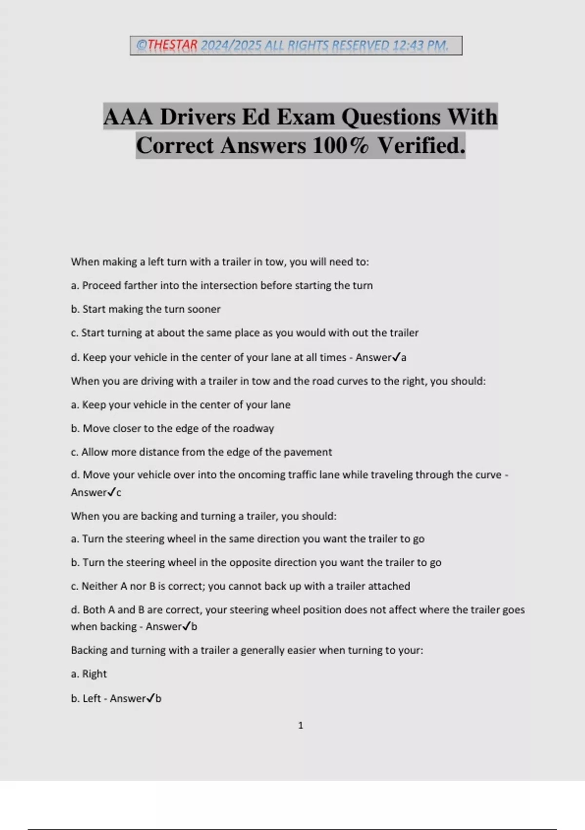 AAA Drivers Ed Exam Questions With