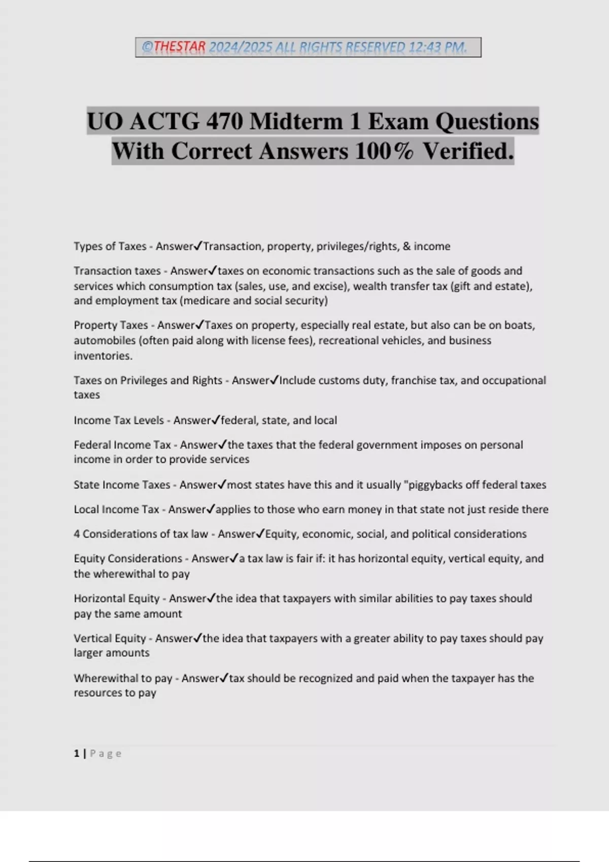 ©THESTAR 2024/2025 ALL RIGHTS RESERVED 12:43 PM. 1 | P a g e UO ACTG 470 Midterm 1 Exam Questions With Correct Answers 100% Verified. Types of Taxes - AnswerTransaction, property, privileges/rights, & income Transaction taxes - Answertaxes on economic transactions such as the sale of goods and services which consumption tax (sales, use, and excise), wealth transfer tax (gift and estate), and employment tax (medicare and social security) Property Taxes - AnswerTaxes on property, especially real estate, but also can be on boats, automobiles (often paid along with license fees), recreational vehicles, and business inventories. Taxes on Privileges and Rights - AnswerInclude customs duty, franchise tax, and occupational taxes Income Tax Levels - Answerfederal, state, and local Federal Income Tax - Answerthe taxes that the federal government imposes on personal income in order to provide services State Income Taxes - Answermost states have this and it usually "piggybacks off federal taxes Local Income Tax - Answerapplies to those who earn money in that state not just reside there 4 Considerations of tax law - AnswerEquity, economic, social, and political considerations Equity Considerations - Answera tax law is fair if: it has horizontal equity, vertical equity, and the wherewithal to pay Horizontal Equity - Answerthe idea that taxpayers with similar abilities to pay taxes should pay the same amount Vertical Equity - Answerthe idea that taxpayers with a greater ability to pay taxes should pay larger amounts Wherewithal to pay - Answerta