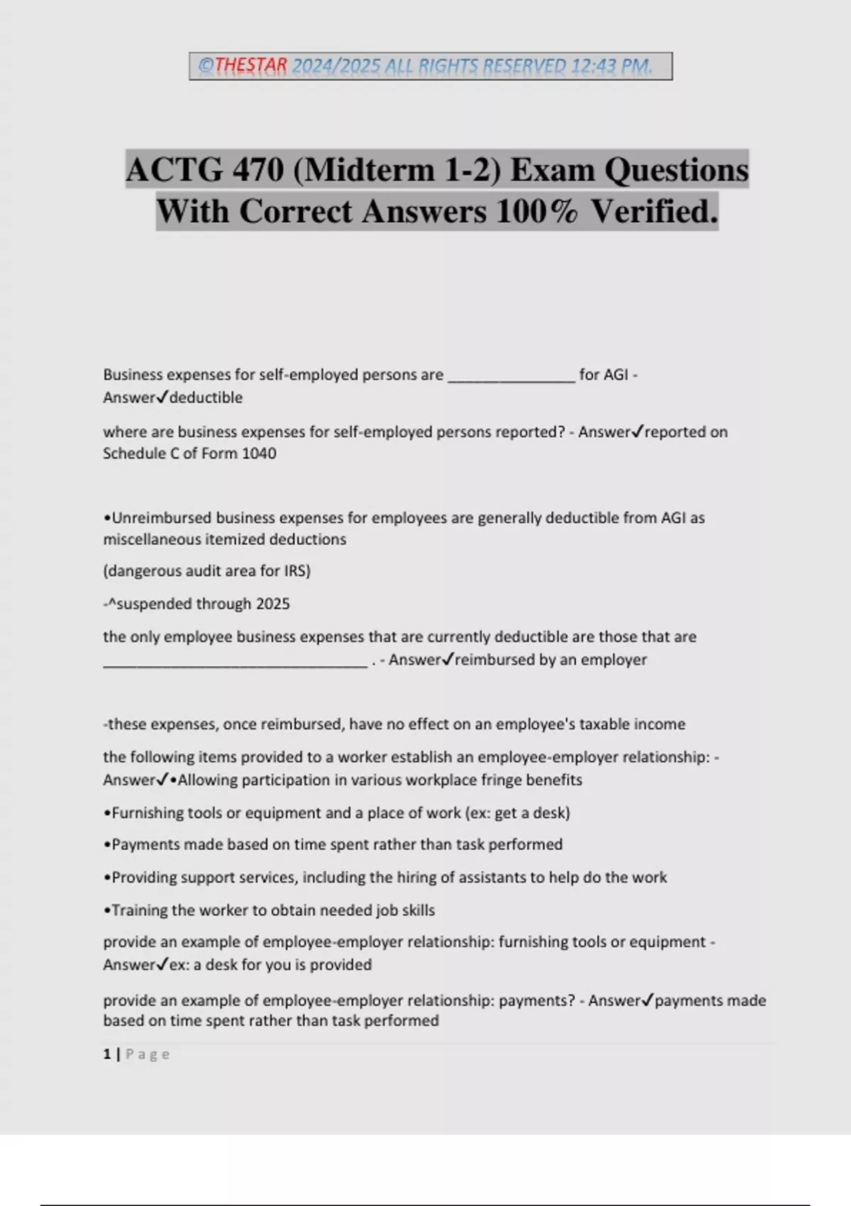 ©THESTAR 2024/2025 ALL RIGHTS RESERVED 12:43 PM. 1 | P a g e ACTG 470 (Midterm 1-2) Exam Questions With Correct Answers 100% Verified. Business expenses for self-employed persons are _______________ for AGI - Answerdeductible where are business expenses for self-employed persons reported? - Answerreported on Schedule C of Form 1040 •Unreimbursed business expenses for employees are generally deductible from AGI as miscellaneous itemized deductions (dangerous audit area for IRS) -^suspended through 2025 the only employee business expenses that are currently deductible are those that are _______________________________ . - Answerreimbursed by an employer -these expenses, once reimbursed, have no effect on an employee's taxable income the following items provided to a worker establish an employee-employer relationship: - Answer•Allowing participation in various workplace fringe benefits •Furnishing tools or equipment and a place of work (ex: get a desk) •Payments made based on time spent rather than task performed •Providing support services, including the hiring of assistants to help do the work •Training the worker to obtain needed job skills provide an example of employee-employer relationship: furnishing tools or equipment - Answerex: a desk for you is provided provide an example of employee-employer relationship: payments? - Answerpayments made based on time spent rather than task performed ©THESTAR 2024/2025 ALL RIGHTS RESERVED 12:43 PM. 2 | P a g e would employers would prefer independent contractors or employees? - Answerindependent contractors -no payroll taxes, health insurance, all benefits, vacation and sick time An insurance premium is ... - Answerthe amount you pay each month (or each year) to keep your insurance policy active example of this. Rentals electrical works for a building. Are the construction workers employees or independent contractors - Answerthey are the independent contractor because they are not employees of the building owner. premiums paid by employer for insurance coverage of employee, spouse, and dependents are _________________ by the employer and ____________________ from the employee's income - Answerdeductible, excluded most Uber drivers would b considered... - Answerindependent contractors payments for the permanent loss or the loss of the use of a member or function of the body or the permanent disfigurement of the employee, the spouse, or a dependent are _____________________ . [taxable/not taxable] - Answernot taxable what do we do with amounts received for medical expenses that were deductible on a prior return? - Answeramounts received for medical expenses that were deducted on a prior return must be included in gross income one way to provide a medical reimbursement plan for employees is as follows... - Answerthe employer purchases a medical insurance plan with a high deductible and then makes contributions to the employee's Health Savings Account (HSA) Health Savings Account (HSA) - AnswerTax-sheltered savings account similar to an IRA but created primarily to pay for medical expenses. employer's contribution to HSA and earnings on funds in the account are __________________ . - Answerexcludible •Contributions limited to 100 percent of deductible amount for individual or family coverage monthly deductible amount is limited to one-twelfth of ______________ under a high- deductible plan for self-only coverage (IF YOUR SINGLE) and one-twelfth of $7,750 for an individual who has family coverage) - AnswerAnnual amounts: $3,850, $7,750 ©THESTAR 2024/2025 ALL RIGHTS RESERVED 12:43 PM. 3 | P a g e •Withdrawals from HSA must be used to reimburse the employee for the medical expenses paid by the employee that are not covered under the high-deductible plan Meals are not taxable to the employee IF: - AnswerFurnished by the employer •On the employer's business premises •For the convenience of the employer Lodging is not taxable to the employee IF: (think of hotel/motel) - AnswerIn case of lodging, the employee is required to accept the lodging as a condition of employment from 2018 to 2025, the employer may only deduct _______ percent of the cost of the meals provided. after 2025, employers ______________ [may/may not] claim any deduction for these meals - Answer50, may not on the employer's business premises requirement, applicable to both meals and lodging, define business premises as simply... - Answer"the place of employment of the employee" convenience of the employer test is intended to focus on the ___________________________ for furnishing the meals and lodging rather than on the benefits received by the employee - Answeremployer's motivation Required as a condition of employment test applies only to lodging... - Answerif the employee's use of the housing would serve the convenience of the employer but the employee is not required to use the housing, the exclusion is not available -employers are 100% tax deductible how do employers account for the first $50,000 of premiums on group life term insurance? - Answerpremiums on the first