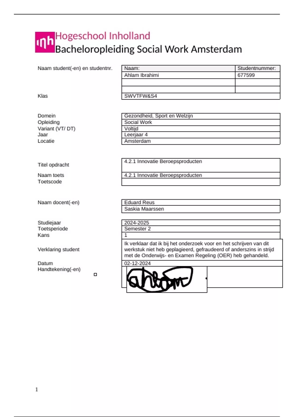 Ahlam Ibrahimi | 677599 | Eduard Reus & Saskia Maarssen | Hogeschool Inholland |