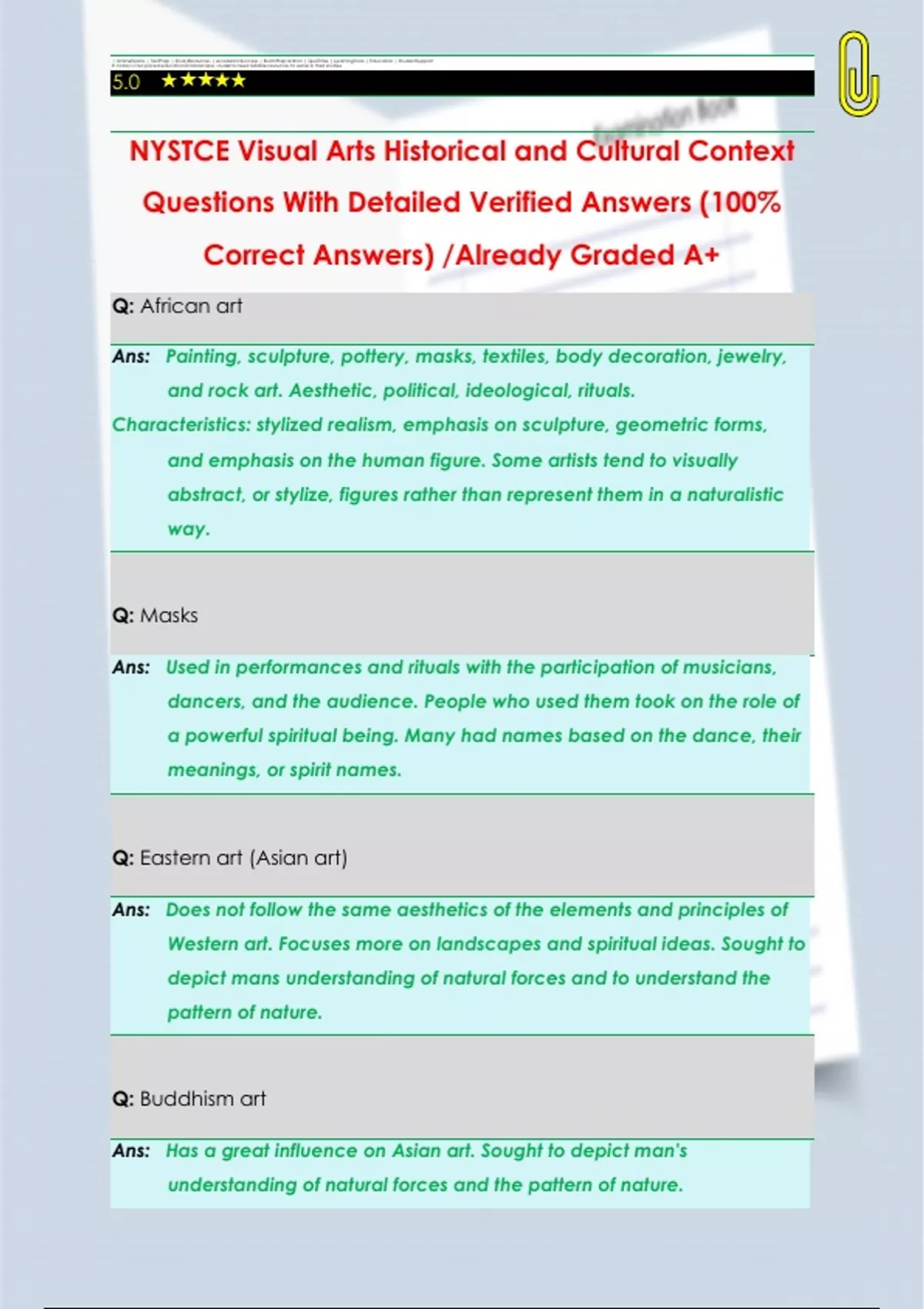 Q: African art Ans: Painting, sculpture, pottery, masks, textiles, body decoration, jewelry, and rock art. Aesthetic, political, ideological, rituals. Characteristics: stylized realism, emphasis on sculpture, geometric forms, and emphasis on the human figure. Some artists tend to visually abstract, or stylize, figures rather than represent them in a naturalistic way. Q: Masks Ans: Used in performances and rituals with the participation of musicians, dancers, and the audience. People who used them took on the role of a powerful spiritual being. Many had names based on the dance, their meanings, or spirit names. Q: Eastern art (Asian art) Ans: Does not follow the same aesthetics of the elements and principles of Western art. Focuses more on landscapes and spiritual ideas. Sought to depict mans understanding of natural forces and to understand the pattern of nature. Q: Buddhism art Ans: Has a great influence on Asian art. Sought to depict man's understanding of natural forces and the pattern of nature. Examstudy - Stuvia US Q: Middle Eastern/Islamic art Ans: Includes artwork created by countries in this region. Muslim and nonMuslim artists included. Religion is the most important aspect. Connection to infinite patterns and man's finite existence. Q: Types of Middle Eastern/Islamic art Ans: Architecture, calligraphy, manuscript, illumination, metalworking, textiles, and more. Q: Early aboriginal art Ans: From Australia. Included rock paintings and carvings. Indigenous art is often created and protected here a national parks. Q: Latin American art Ans: A blend of three cultures: Native American, African, and European. Begins with the indigenous people. Utilitarian to then values and religions of the different regions.
